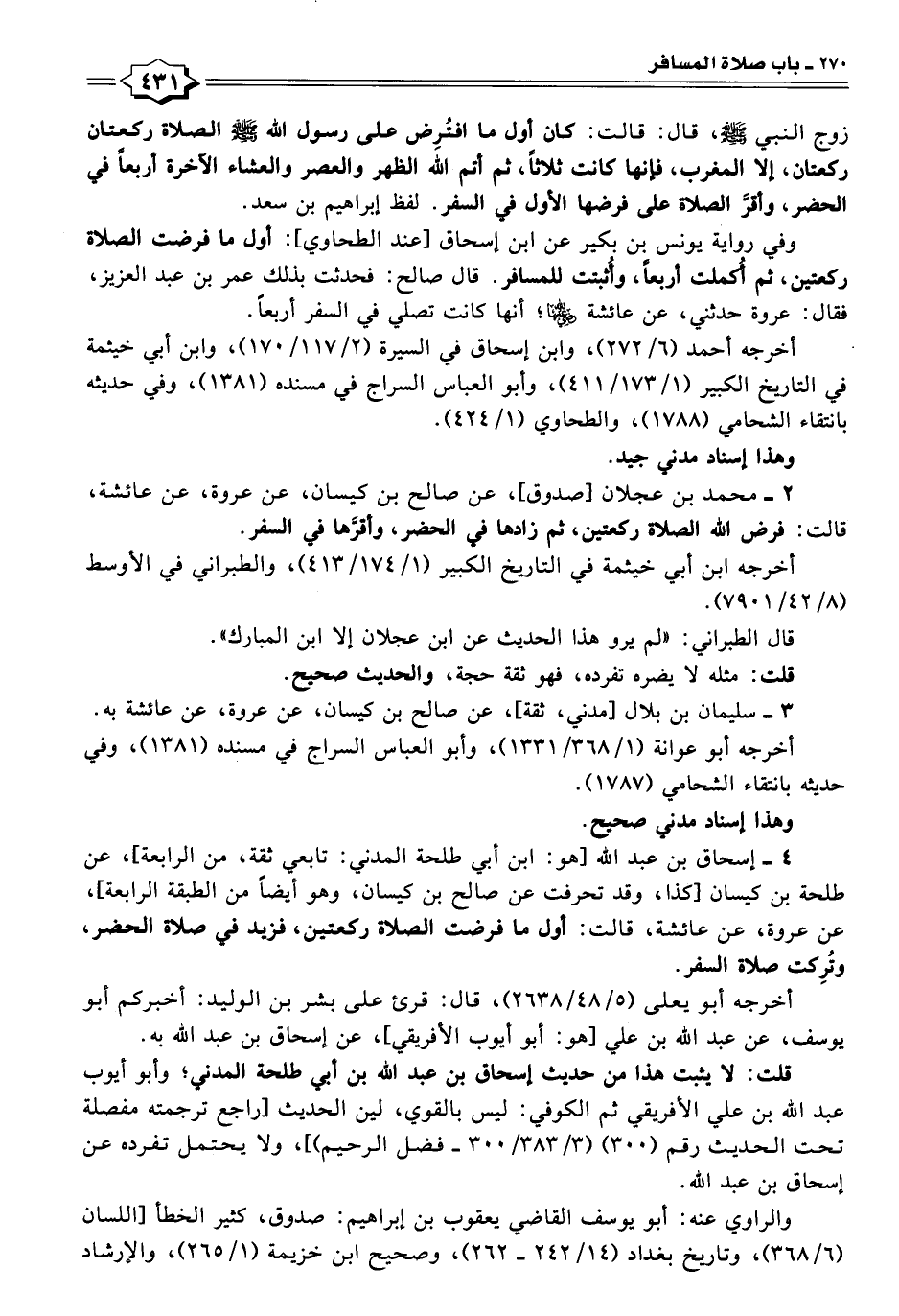 ٤ - إسحاق بن عبد اللَّه [هو: ابن أبي طلحة المدني: تابعي ثقة، من الرابعة]، عن طلحة بن كيسان [كذا، وقد تحرفت عن صالح بن كيسان، وهو أيضًا من الطبقة الرابعة]، عن عروة، عن عائشة، قالت: أول ما فرضت الصلاة ركعتين، فزبد في صلاة الحضر، وتُرِكت صلاة السفر.