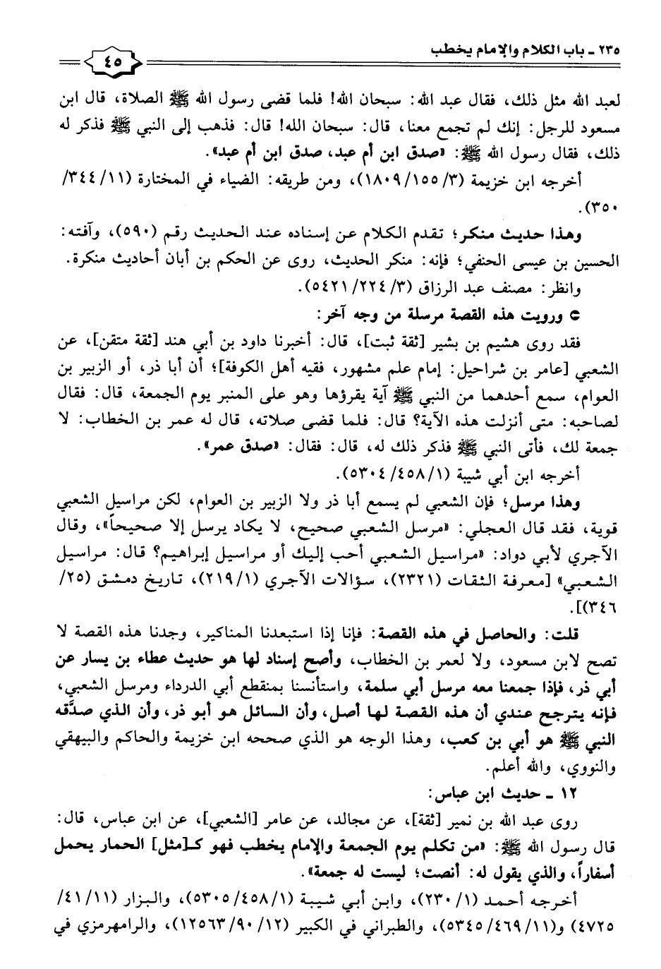 فقد روى هشيم بن بشير [ثقة ثبت]، قال: أخبرنا داود بن أبي هند [ثقة متقن]، عن الشعبي [عامر بن شراحيل: إمام علم مشهور، فقيه أهل الكوفة]؛ أن أبا ذر، أو الزبير بن العوام، سمع أحدهما من النبي - صلى الله عليه وسلم - آية يقرؤها وهو على المنبر يوم الجمعة، قال: فقال لصاحبه: متى أنزلت هذه الآية؟ قال: فلما قضى صلاته، قال له عمر بن الخطاب: لا جمعة لك، فأتى النبي - صلى الله عليه وسلم - فذكر ذلك له، قال: فقال: "صدق عمر".
