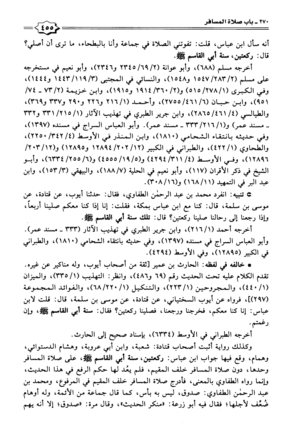 * تنبيه: انفرد محمد بن عبد الرحمن الطفاوي، فقال: حدثنا أيوب، عن قتادة، عن موسى بن سلمة، قال: كنا مع ابن عباس بمكة، فقلت: إنا إذا كنا معكم صلينا أربعًا، وإذا رجعنا إلى رحالنا صلينا ركعتين؟ قال: تلك سنة أبي القاسم -صلى اللَّه عليه وسلم-.