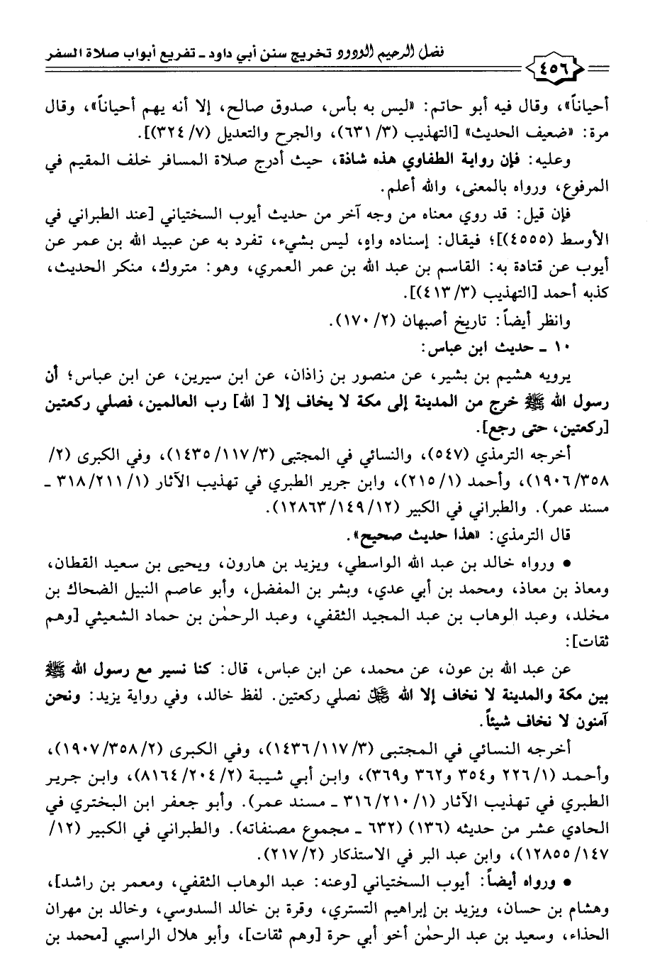 يرويه هشيم بن بشير، عن منصور بن زاذان، عن ابن سيرين، عن ابن عباس؛ أن رسول اللَّه -صلى اللَّه عليه وسلم- خرج من المدينة إلى مكة لا يخاف إلا [اللَّه] رب العالمين، فصلي ركعتين [ركعتين، حتى رجع].