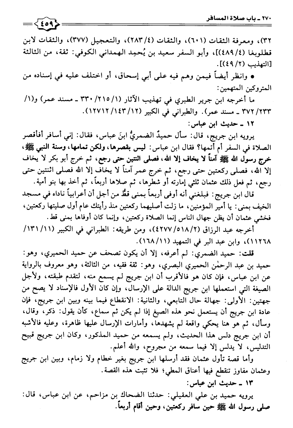 يرويه ابن جريج، قال: سال حميدٌ الضمريُّ ابنَ عباس، فقال: إني أسافر أفأقصر الصلاة في السفر أم أتمها؟ فقال ابن عباس: ليس بقصرها، ولكن تمامها، وسنة النبي -صلى اللَّه عليه وسلم-، خرج رسول اللَّه -صلى اللَّه عليه وسلم- آمنًا لا يخاف إلا اللَّه، فصلى اثنتين حتى رجع، ثم خرج أبو بكر لا يخاف إلا اللَّه، فصلى ركعتين حتى رجع، ثم خرج عمر آمنًا لا يخاف إلا اللَّه فصلى اثنتين حتى رجع، ثم فعل ذلك عثمان ثلثي إمارته أو شطرها، ثم صلاها أربعًا، ثم أخذ بها بنو أمية.