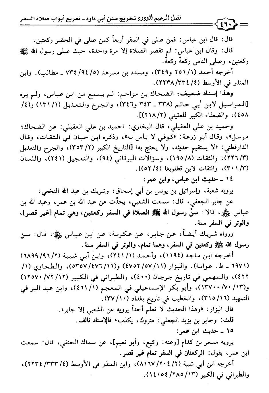 عن جابر الجعفيِ، قال: سمعت الشعبي، يحدِّث عن عبد اللَّه بن عمر، وعبد اللَّه بن عباس -رضي اللَّه عنهم-، قالا: سنَّ رسول اللَّه الصلاة في السفر ركعتين، وهي تمام [غير قصر]، والوتر في السفر سنة.