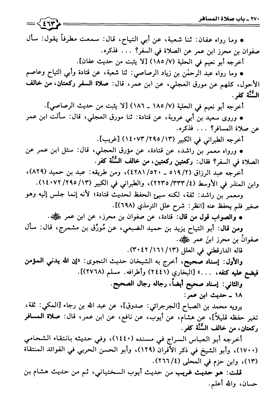 • وما رواه عبد الرحمن بن زياد الرصاصي: ثنا شعبة، عن قتادة وأبي التياح وعاصم الأحول، كلهم عن مورق العجلي، عن ابن عمر، قال: صلاة السفر ركعتان، من خالف السُّنَّة كفر.