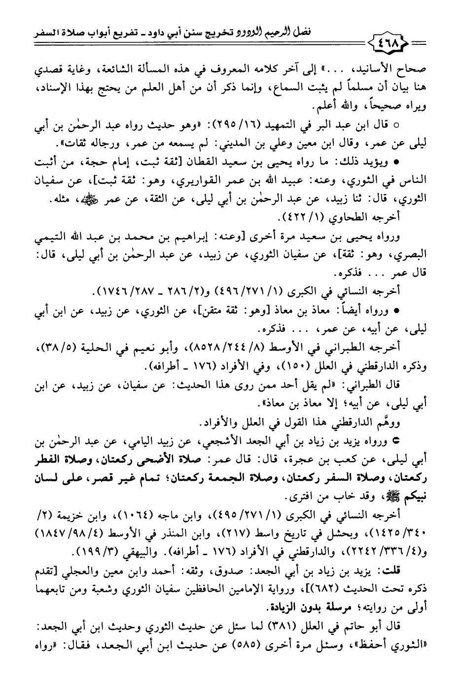 * ورواه يزيد بن زياد بن أبي الجعد الأشجعي، عن زبيد اليامي، عن عبد الرحمن بن أبي ليلى، عن كعب بن عجرة، قال: قال عمر: صلاة الأضحى ركعتان، وصلاة الفطر ركعتان، وصلاة السفر ركعتان، وصلاة الجمعة ركعتان؛ تمام غير قصر، على لسان نبيكم -رضي اللَّه عنه-، وقد خاب من افترى.