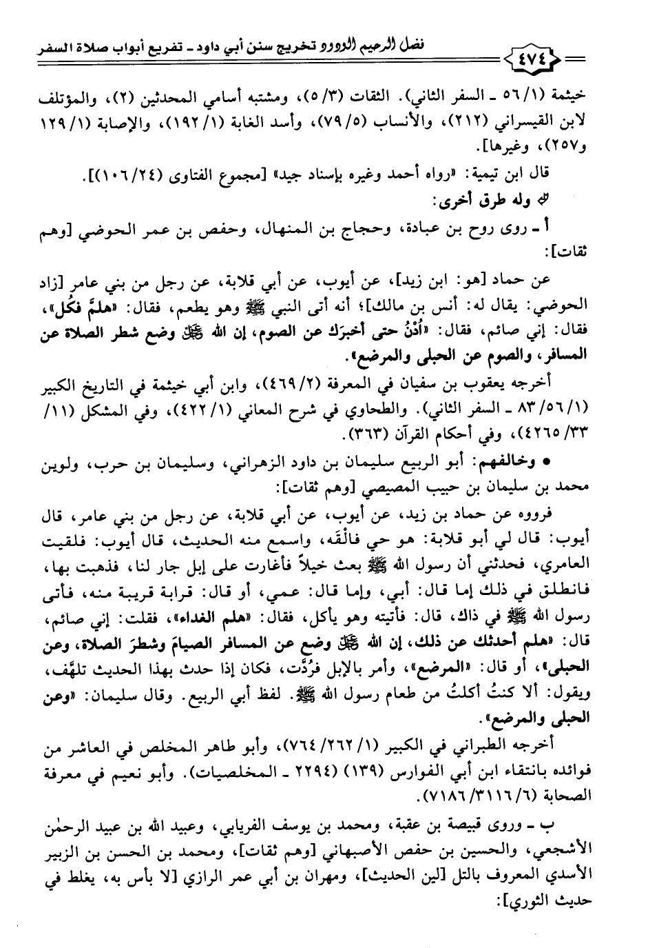 فرووه عن حماد بن زيد، عن أيوب، عن أبي قلابة، عن رجل من بني عامر، قال أيوب: قال لي أبو قلابة: هو حي فالْقَه، واسمع منه الحديث، قال أيوب: فلقيت العامري، فحدثني أن رسول اللَّه -صلى اللَّه عليه وسلم- بعث خيلًا فأغارت على إبل جار لنا، فذهبت بها، فانطلق في ذلك إما قال: أبي، وإما قال: عمي، أو قال: قرابة قريبة منه، فأتى رسول اللَّه -صلى اللَّه عليه وسلم- في ذاك، قال: فأتيته وهو يأكل، فقال: "هلم الغداء"، فقلت: إني صائم، قال: "هلم أحدثك عن ذلك، إن اللَّه عز وجل وضع عن المسافر الصيامَ وشطرَ الصلاة، وعن الحبلى"، أو قال: "المرضع"، وأمر بالإبل فرُدَّت، فكان إذا حدث بهذا الحديث تلفَّف، ويقول: ألا كنتُ أكلتُ من طعام رسول اللَّه -صلى اللَّه عليه وسلم-. لفظ أبي الربيع. وقال سليمان: "وعن الحبلى والمرضع".