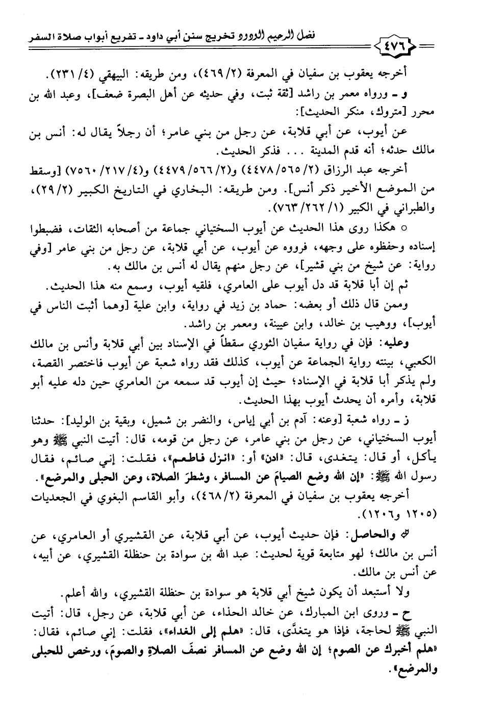 ح- وروى ابن المبارك، عن خالد الحذاء، عن أبي قلابة، عن رجل، قال: أتيت النبي -صلى اللَّه عليه وسلم- لحاجة، فإذا هو يتغذَّى، قال: "هلم إلى الغداء"، فقلت: إني صائم، فقال: "هلم أخبرك عن الصوم؛ إن اللَّه وضع عن المسافر نصفَ الصلاةِ والصومَ، ورخص للحبلى والمرضع".