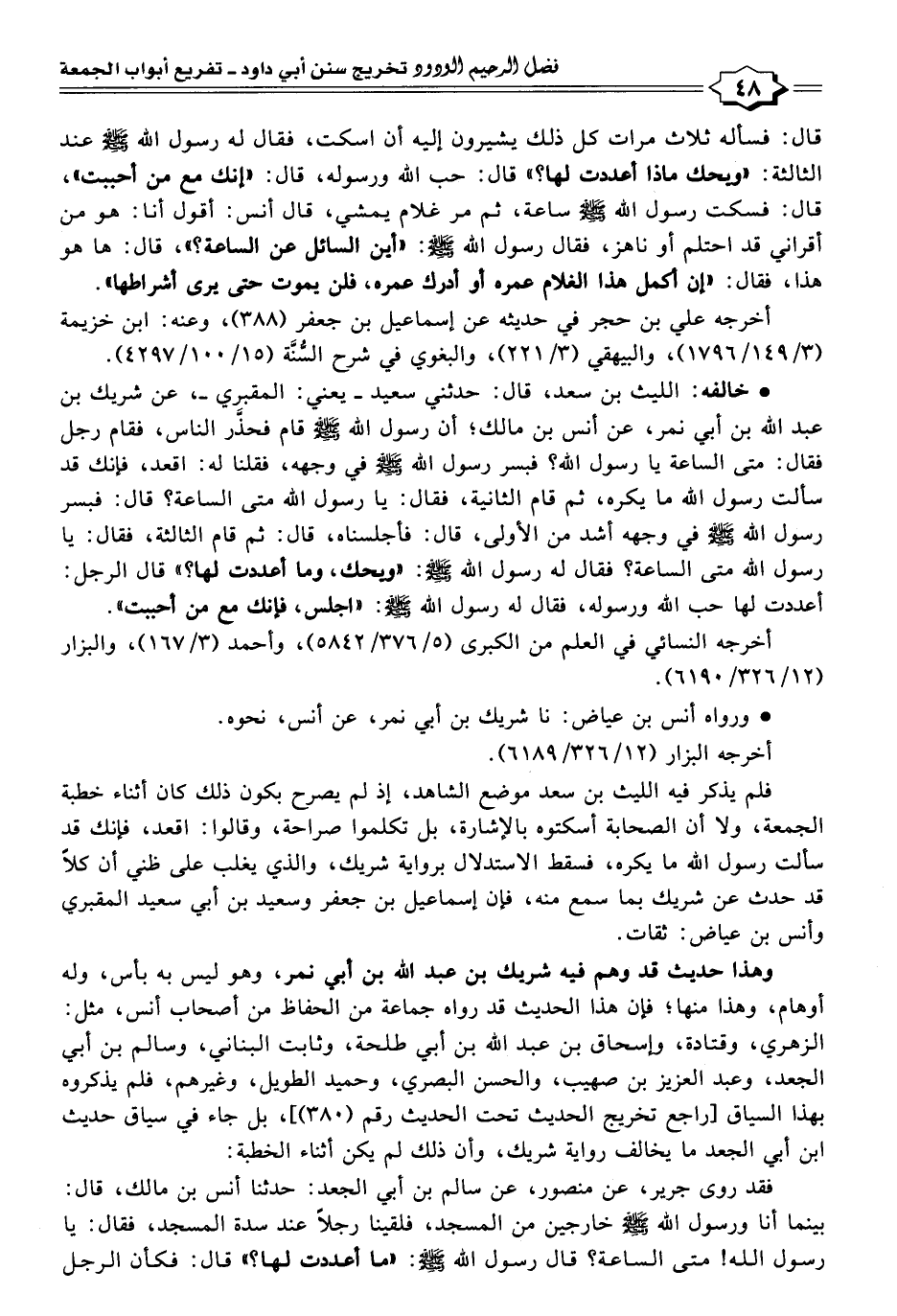 فلم يذكر فيه الليث بن سعد موضع الشاهد، إذ لم يصرح بكون ذلك كان أثناء خطبة الجمعة، ولا أن الصحابة أسكتوه بالإشارة، بل تكلموا صراحة، وقالوا: اقعد، فإنك قد سألت رسول الله ما يكره، فسقط الاستدلال برواية شريك، والذي يغلب على ظني أن كلًا قد حدث عن شريك بما سمع منه، فإن إسماعيل بن جعفر وسعيد بن أبي سعيد المقبري وأنس بن عياض: ثقات.