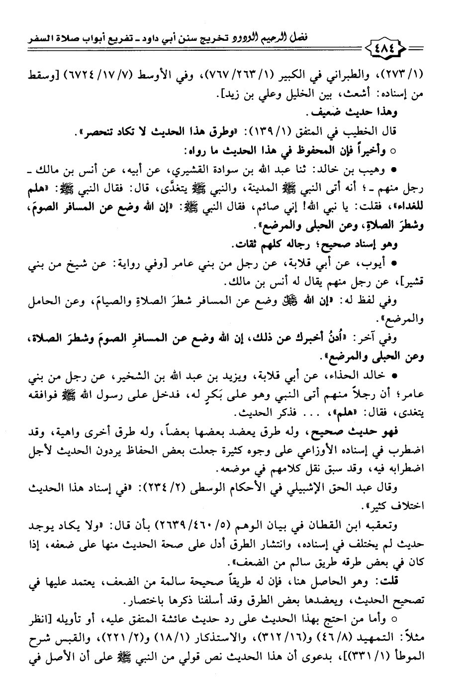 • وهيب بن خالد: ثنا عبد اللَّه بن سوادة القشيري، عن أبيه، عن أنس بن مالك -رجل منهم-؛ أنه أتى النبي -صلى اللَّه عليه وسلم- المدينة، والنبي -صلى اللَّه عليه وسلم- يتغدَّى، قال: فقال النبي -صلى اللَّه عليه وسلم-: "هلم للغداء"، فقلت: يا نبي اللَّه! إني صائم، فقال النبي -صلى اللَّه عليه وسلم-: "إن اللَّه وضع عن المسافر الصومَ، وشطرَ الصلاةِ، وعن الحبلى والمرضع".