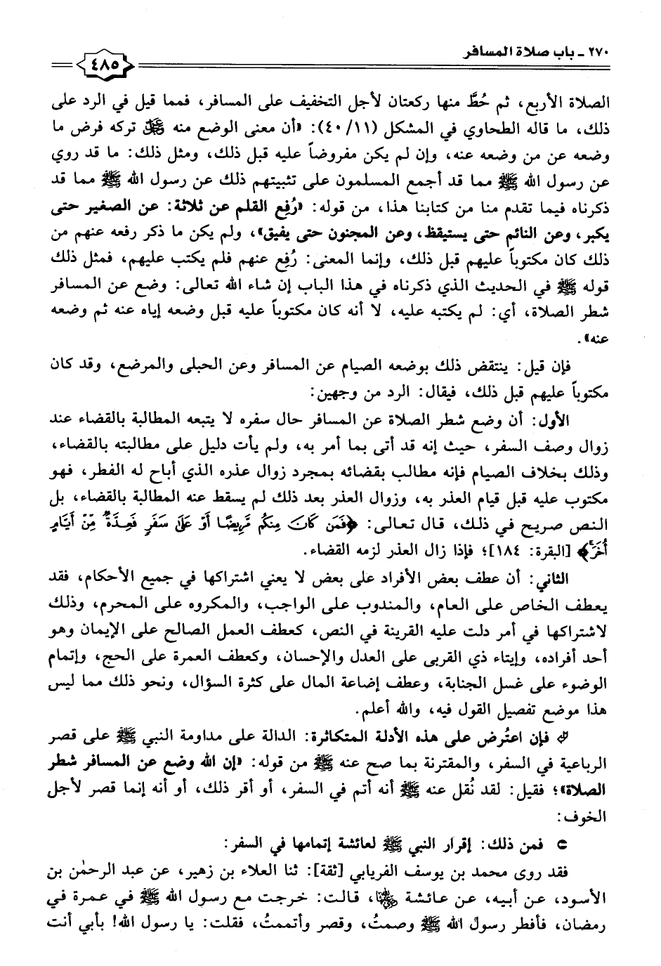 * فإن اعتُرض على هذه الأدلة المتكاثرة: الدالة على مداومة النبي -صلى اللَّه عليه وسلم- على قصر الرباعية في السفر، والمقترنة بما صح عنه -صلى اللَّه عليه وسلم- من قوله: "إن اللَّه وضع عن المسافر شطر الصلاة"؛ فقيل: لقد نُقل عنه -صلى اللَّه عليه وسلم- أنه أتم في السفر، أو أقر ذلك، أو أنه إنما قصر لأجل الخوف: