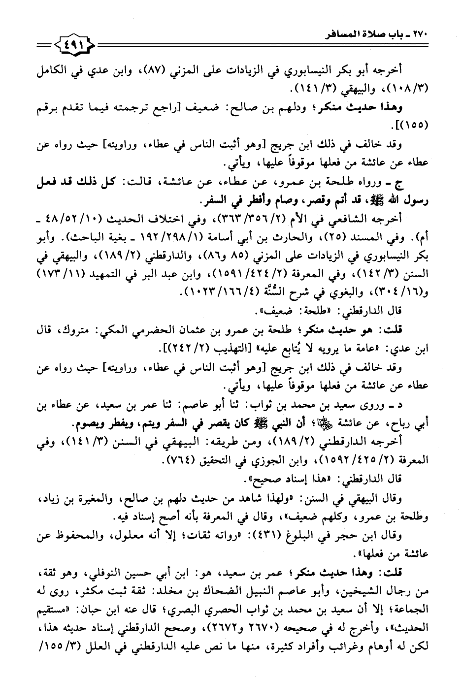 ج- ورواه طلحة بن عمرو، عن عطاء، عن عائشة، قالت: كل ذلك قد فعل رسول اللَّه -صلى اللَّه عليه وسلم-، قد أتم وقصر، وصام وأفطر في السفر.
