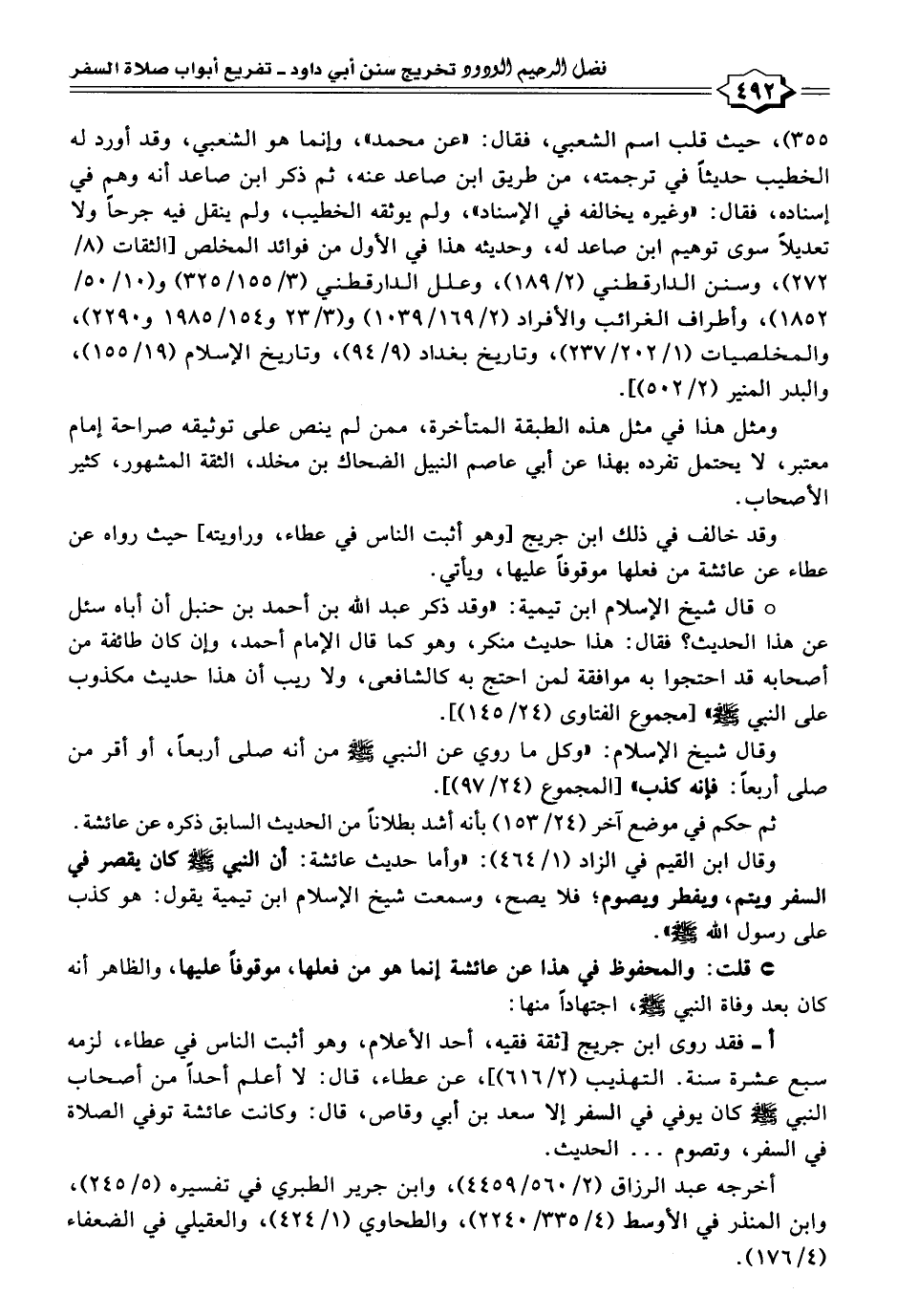 وقال ابن القيم في الزاد (١/ ٤٦٤): "وأما حديث عائشة: أن النبي -صلى اللَّه عليه وسلم- كان يقصر في السفر ويتم، وبفطر ويصوم؛ فلا يصح، وسمعت شيخ الإسلام ابن تيمية يقول: هو كذب على رسول اللَّه -صلى اللَّه عليه وسلم-".