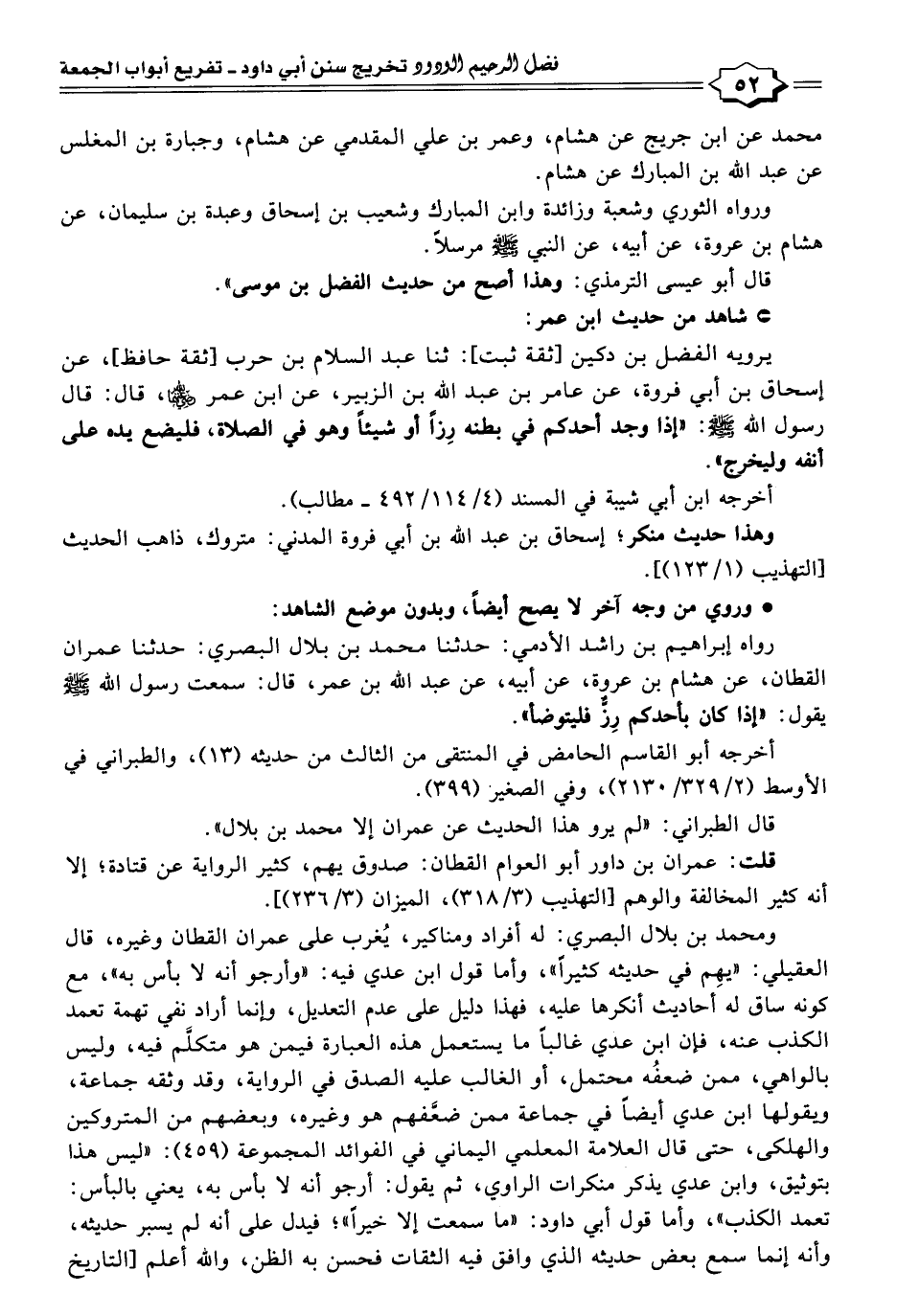 ومحمد بن بلال البصري: له أفراد ومناكير، يُغرب على عمران القطان وغيره، قال العقيلي: "يهِم في حديثه كثيرًا"، وأما قول ابن عدي فيه: "وأرجو أنه لا بأس به"، مع كونه ساق له أحاديث أنكرها عليه، فهذا دليل على عدم التعديل، وإنما أراد نفي تهمة تعمد الكذب عنه، فإن ابن عدي غالبًا ما يستعمل هذه العبارة فيمن هو متكلَّم فيه، وليس بالواهي، ممن ضعفُه محتمل، أو الغالب عليه الصدق في الرواية، وقد وثقه جماعة، ويقولها ابن عدي أيضًا في جماعة ممن ضعَّفهم هو وغيره، وبعضهم من المتروكين والهلكى، حتى قال العلامة المعلمي اليماني في الفوائد المجموعة (٤٥٩): "ليس هذا بتوثيق، وابن عدي يذكر منكرات الراوي، ثم يقول: أرجو أنه لا بأس به، يعني بالبأس: تعمد الكذب"، وأما قول أبي داود: "ما سمعت إلا خيرًا"؛ فيدل على أنه لم يسبر حديثه، وأنه إنما سمع بعض حديثه الذي وافق فيه الثقات فحسن به الظن، والله أعلم [التاريخ