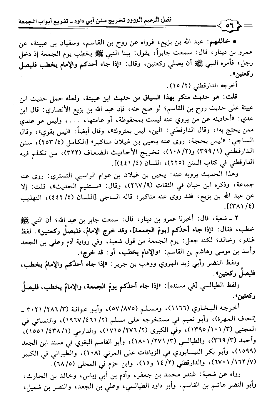 • خالفهم: عبد اللَّه بن بزيع، فرواه عن روح بن القاسم، وسفيان بن عيينة، عن عمرو بن دينار، قال: سمعت جابرًا، يقول: بينا النبي -صلى اللَّه عليه وسلم- يخطب يوم الجمعة إذ دخل رجل، فأمره النبي -صلى اللَّه عليه وسلم- أن يصلي ركعتين، وقال: "إذا جاء أحدكم والإمام يخطب فليصل ركعتين".