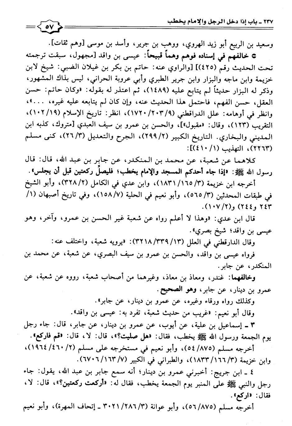 ٤ - ابن جريج: أخبرني عمرو بن دينار؛ أنه سمع جابر بن عبد اللَّه، يقول: جاء رجل والنبي -صلى اللَّه عليه وسلم- على المنبر يوم الجمعة يخطب، فقال له: "أركعت ركعتين؟ "، قال: لا، فقال: "اركع".
