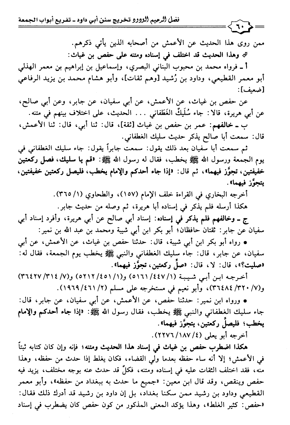 ب- خالفهم: عمر بن حفص بن غياث [ثقة]، قال: ثنا أبي، قال: ثنا الأعمش، قال: سمعت أبا صالح يذكر حديث سليك الغطفاني.