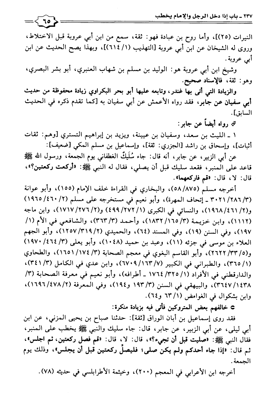 عن أبي الزبير، عن جابر، أنه قال: جاء سُلَيكٌ الغطفاني يوم الجمعة، ورسول اللَّه -صلى اللَّه عليه وسلم- قاعد على المنبر، فقعد سليك قبل أن يصلي، فقال له النبي -صلى اللَّه عليه وسلم-: "أركعت ركعتين؟ "، قال: لا، قال: "قم فاركعهما".