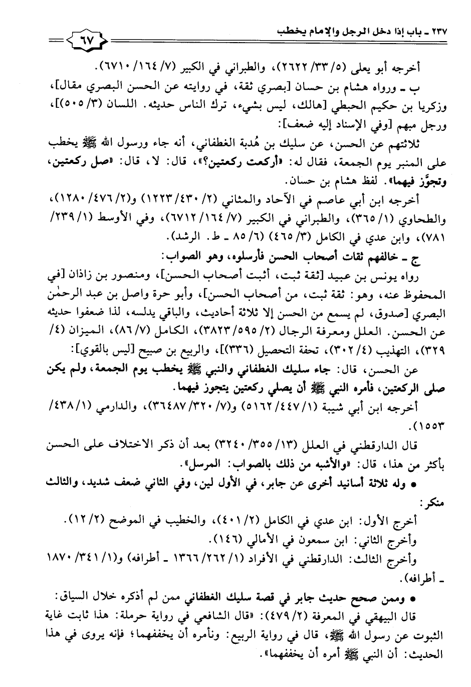 ثلاثتهم عن الحسن، عن سليك بن هُدبة الغطفاني، أنه جاء ورسول اللَّه -صلى اللَّه عليه وسلم- يخطب على المنبر يوم الجمعة، فقال له: "أركعت ركعتين؟ "، قال: لا، قال: "صل ركعتين، وتجوَّز فيهما". لفظ هشام بن حسان.