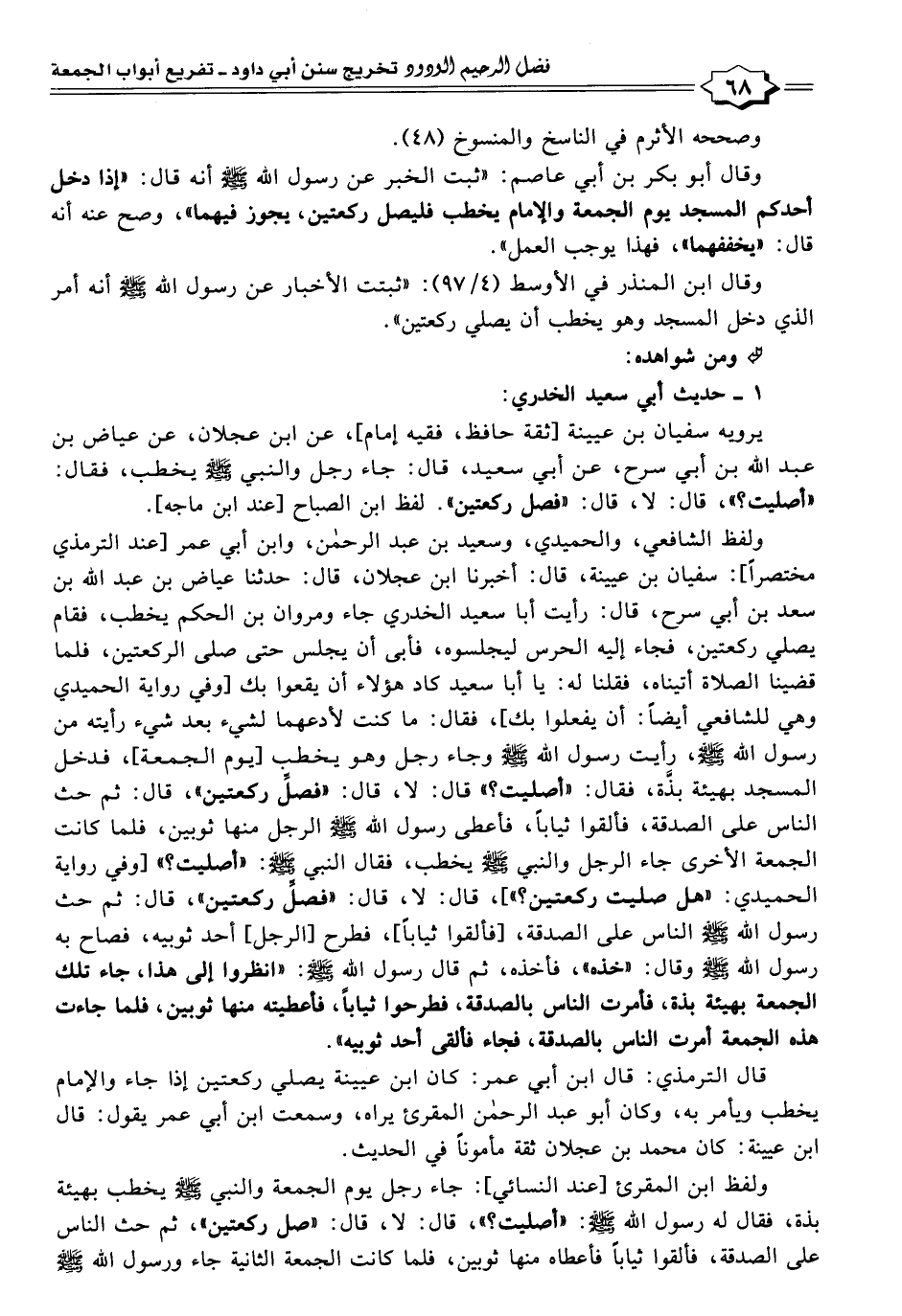 ولفظ الشافعي، والحميدي، وسعيد بن عبد الرحمن، وابن أبي عمر [عند الترمذي مختصرًا]: سفيان بن عيينة، قال: أخبرنا ابن عجلان، قال: حدثنا عياض بن عبد اللَّه بن سعد بن أبي سرح، قال: رأيت أبا سعيد الخدري جاء ومروان بن الحكم يخطب، فقام يصلي ركعتين، فجاء إليه الحرس ليجلسوه، فأبى أن يجلس حتى صلى الركعتين، فلما قضينا الصلاة أتيناه، فقلنا له: يا أبا سعيد كاد هؤلاء أن يقعوا بك [وفي رواية الحميدي وهي للشافعي أيضًا: أن يفعلوا بك]، فقال: ما كنت لأدعهما لشيء بعد شيء رأيته من رسول اللَّه -صلى اللَّه عليه وسلم-، رأيت رسول اللَّه -صلى اللَّه عليه وسلم- وجاء رجل وهو يخطب [يوم الجمعة]، فدخل المسجد بهيئة بذَّة، فقال: "أصليت؟ " قال: لا، قال: "فصلِّ ركعتين"، قال: ثم حث الناس على الصدقة، فألقوا ثيابًا، فأعطى رسول اللَّه -صلى اللَّه عليه وسلم- الرجل منها ثوبين، فلما كانت الجمعة الأخرى جاء الرجل والنبي -صلى اللَّه عليه وسلم- يخطب، فقال النبي -صلى اللَّه عليه وسلم-: "أصليت؟ " [وفي رواية الحميدي: "هل صليت ركعتين؟ "]، قال: لا، قال: "فصلِّ ركعتين"، قال: ثم حث رسول اللَّه -صلى اللَّه عليه وسلم- الناس على الصدقة، [فألقوا ثيابًا]، فطرح [الرجل] أحد ثوبيه، فصاح به رسول اللَّه -صلى اللَّه عليه وسلم- وقال: "خذه"، فأخذه، ثم قال رسول اللَّه -صلى اللَّه عليه وسلم-: "انظروا إلى هذا، جاء تلك الجمعة بهيئة بذة، فأمرت الناس بالصدقة، فطرحوا ثيابًا، فأعطيته منها ثوبين، فلما جاءت هذه الجمعة أمرت الناس بالصدقة، فجاء فألقى أحد ثوبيه".