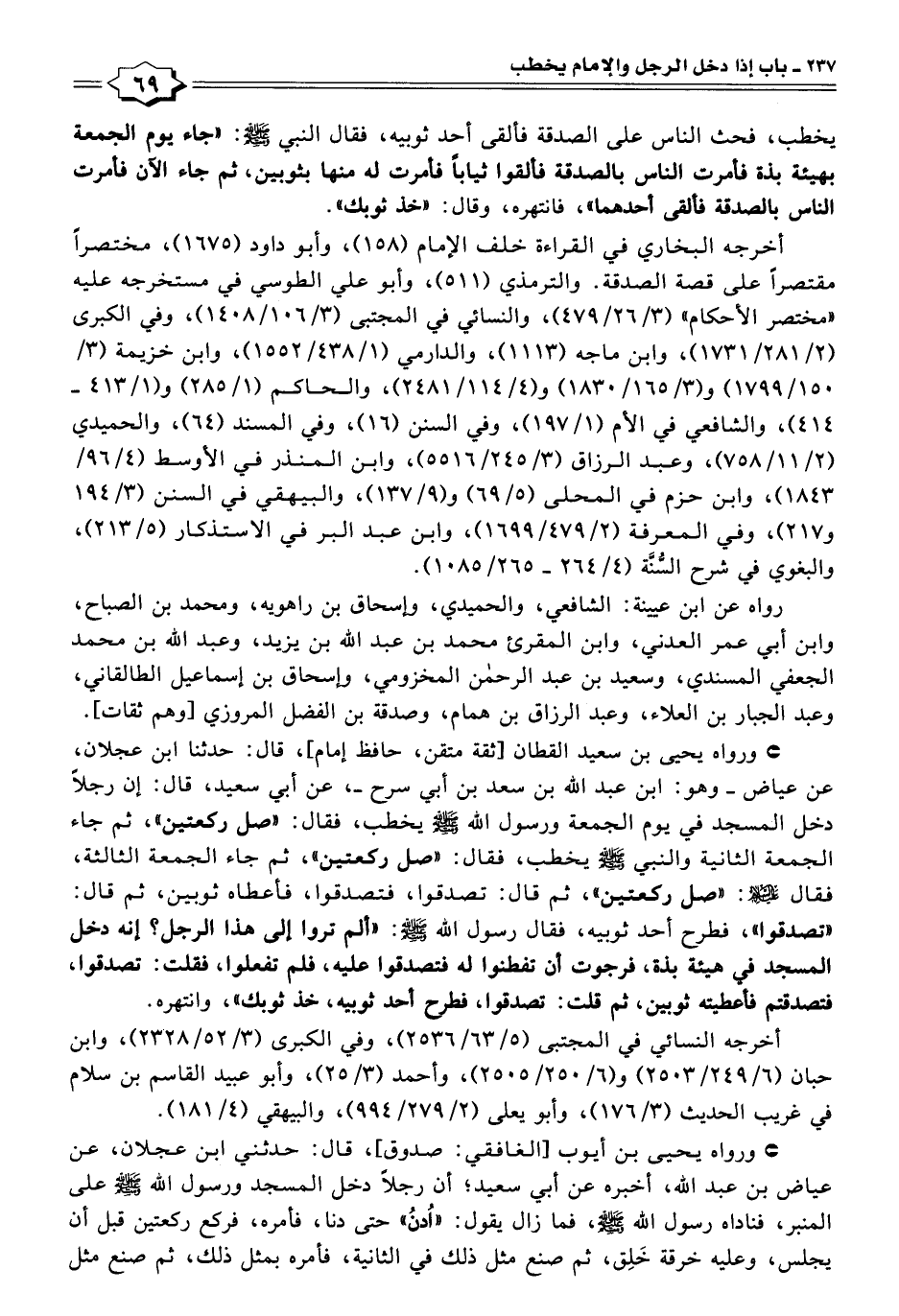 * ورواه يحيى بن سعيد القطان [ثقة متقن، حافظ إمام]، قال: حدثنا ابن عجلان، عن عياض -وهو: ابن عبد اللَّه بن سعد بن أبي سرح-، عن أبي سعيد، قال: إن رجلًا دخل المسجد في يوم الجمعة ورسول اللَّه -صلى اللَّه عليه وسلم- يخطب، فقال: "صل ركعتين"، ثم جاء الجمعة الثانية والنبي -صلى اللَّه عليه وسلم- يخطب، فقال: "صل ركعتين"، ثم جاء الجمعة الثالثة، فقال -صلى اللَّه عليه وسلم-: "صل ركعتين"، ثم قال: تصدقوا، فتصدقوا، فأعطاه ثوبين، ثم قال: "تصدقوا"، فطرح أحد ثوبيه، فقال رسول اللَّه -صلى اللَّه عليه وسلم-: "ألم تروا إلى هذا الرجل؟ إنه دخل المسجد في هيئة بذة، فرجوت أن تفطنوا له فتصدقوا عليه، فلم تفعلوا، فقلت: تصدقوا، فتصدقتم فأعطيته ثوبين، ثم قلت: تصدقوا، فطرح أحد ثوبيه، خذ ثوبك"، وانتهره.