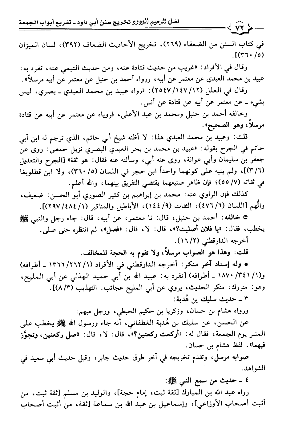 * خالفه: أحمد بن حنبل، قال: نا معتمر، عن أبيه، قال: جاء رجل والنبي -صلى اللَّه عليه وسلم- يخطب، فقال: "يا فلان أصليت؟ "، قال: لا، قال: "فصل"، ثم انتظره حتى صلى.