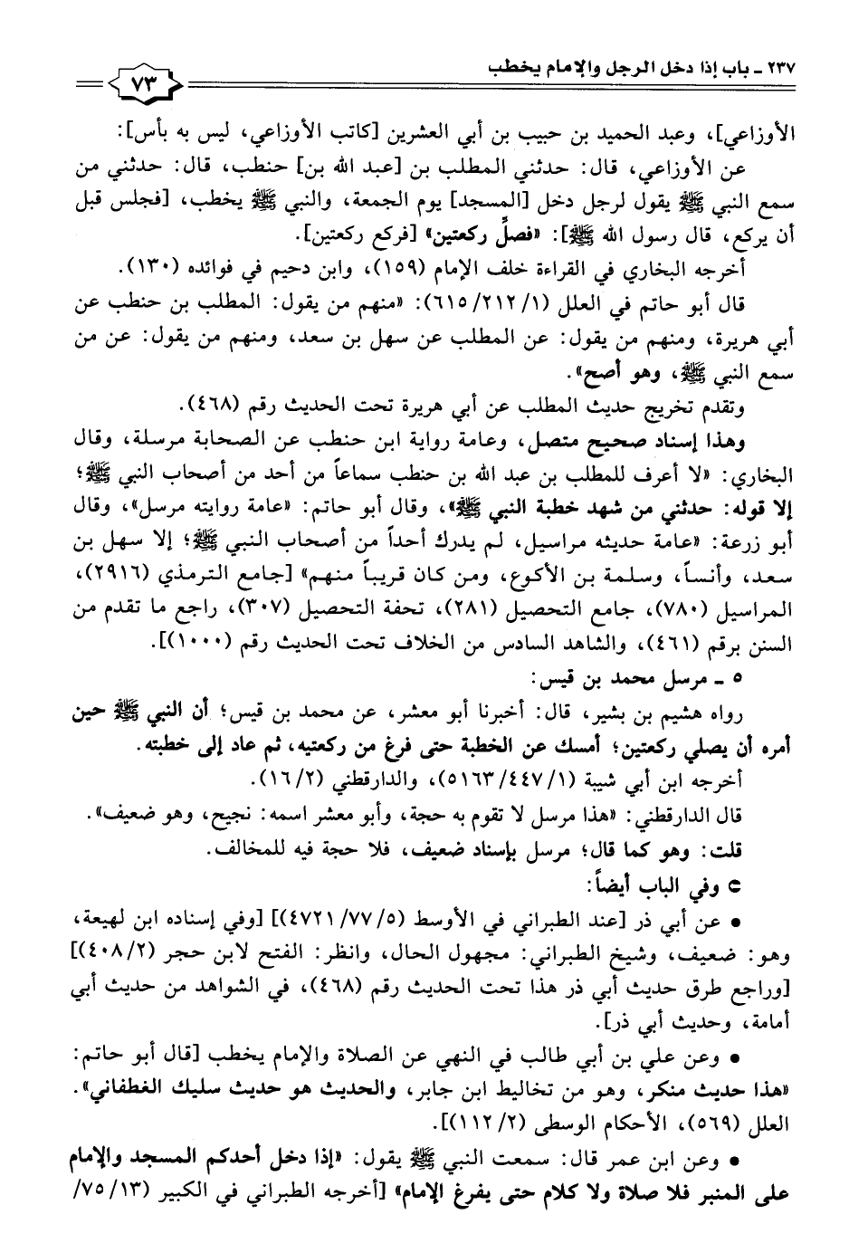 رواه هشيم بن بشير، قال: أخبرنا أبو معشر، عن محمد بن قيس؛ أن النبي -صلى اللَّه عليه وسلم- حين أمره أن يصلي ركعتين؛ أمسك عن الخطبة حتى فرغ من ركعتيه، ثم عاد إلى خطبته.