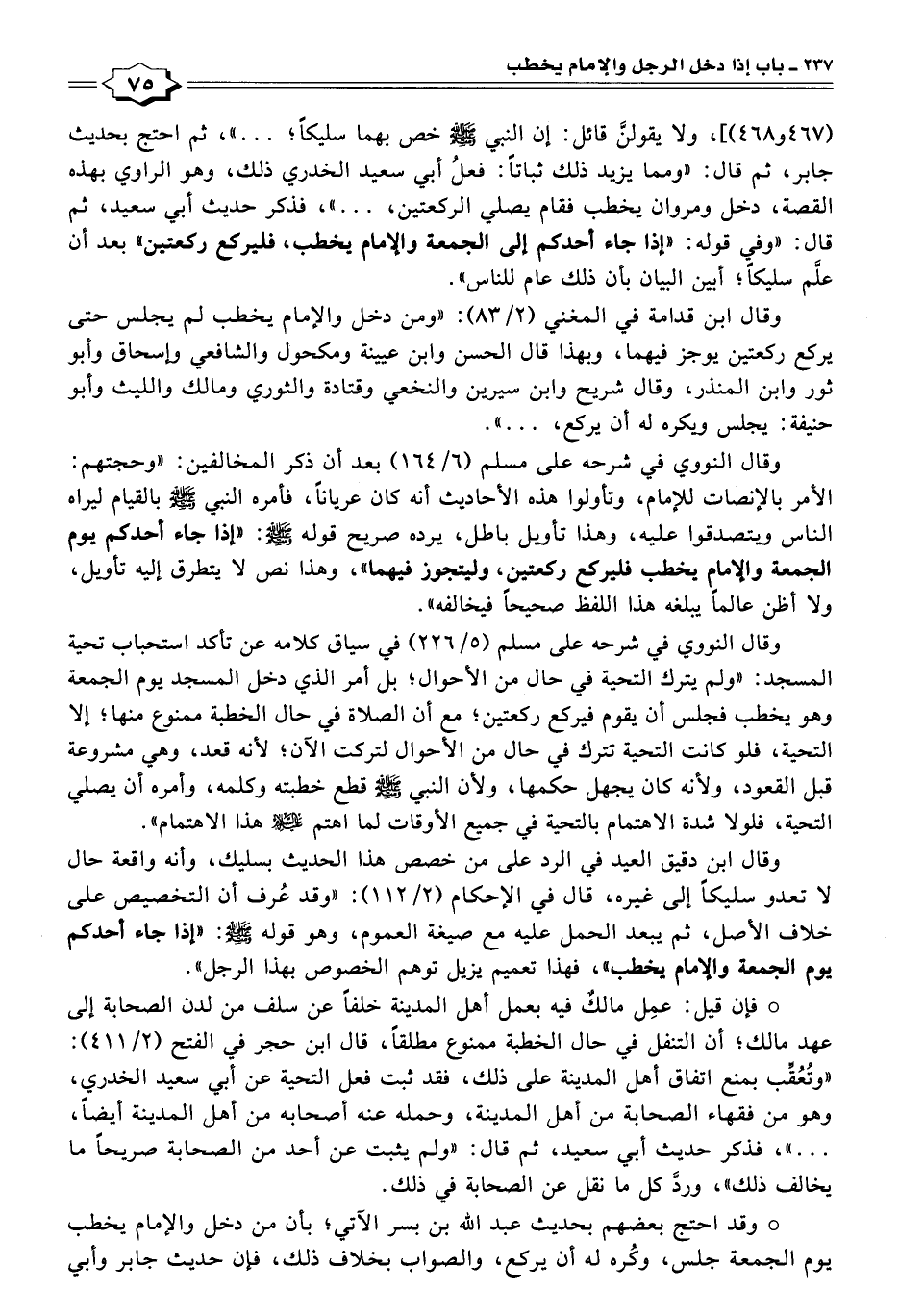 (٤٦٧ و ٤٦٨)]، ولا يقولنَّ قائل: إن النبي -صلى اللَّه عليه وسلم- خص بهما سليكًا؛. . . "، ثم احتج بحديث جابر، ثم قال: "ومما يزيد ذلك ثباتًا: فعلُ أبي سعيد الخدري ذلك، وهو الراوي بهذه القصة، دخل ومروان يخطب فقام يصلي الركعتين،. . . "، فذكر حديث أبي سعيد، ثم قال: "وفي قوله: "إذا جاء أحدكم إلى الجمعة والإمام يخطب، فليركع ركعتين" بعد أن علَّم سليكًا؛ أبين البيان بأن ذلك عام للناس".