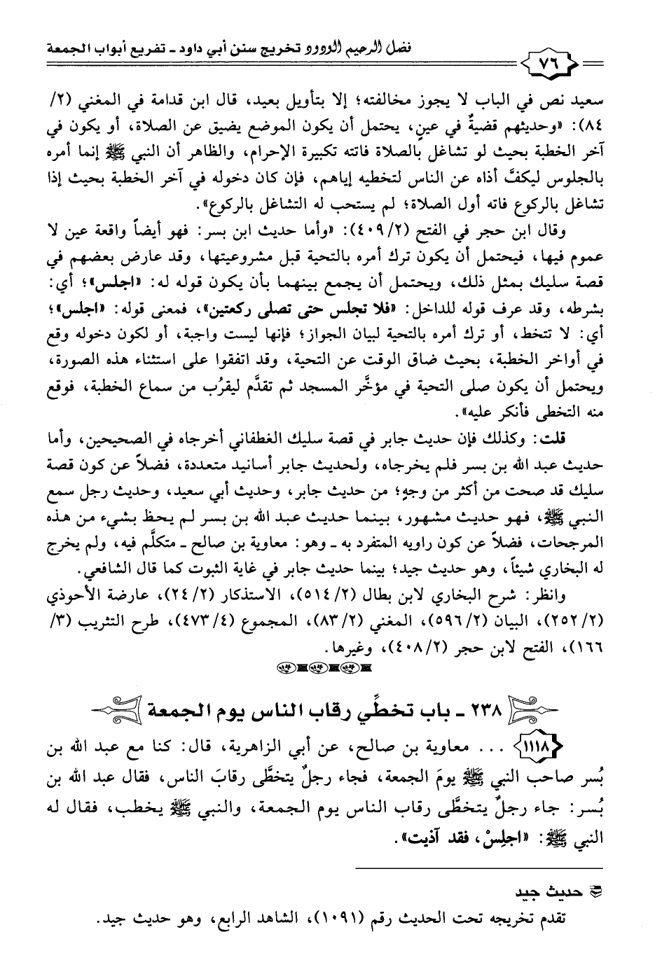قلت: وكذلك فإن حديث جابر في قصة سليك الغطفاني أخرجاه في الصحيحين، وأما حديث عبد اللَّه بن بسر فلم يخرجاه، ولحديث جابر أسانيد متعددة، فضلًا عن كون قصة سليك قد صحت من أكثر من وجهٍ؛ من حديث جابر، وحديث أبي سعيد، وحديث رجل سمع النبي -صلى اللَّه عليه وسلم-، فهو حديث مشهور، بينما حديث عبد اللَّه بن بسر لم يحظ بشيء من هذه المرجحات، فضلًا عن كون راويه المتفرد به- وهو: معاوية بن صالح- متكلَّم فيه، ولم يخرج له البخاري شيئًا، وهو حديث جيد؛ بينما حديث جابر في غاية الثبوت كما قال الشافعي.