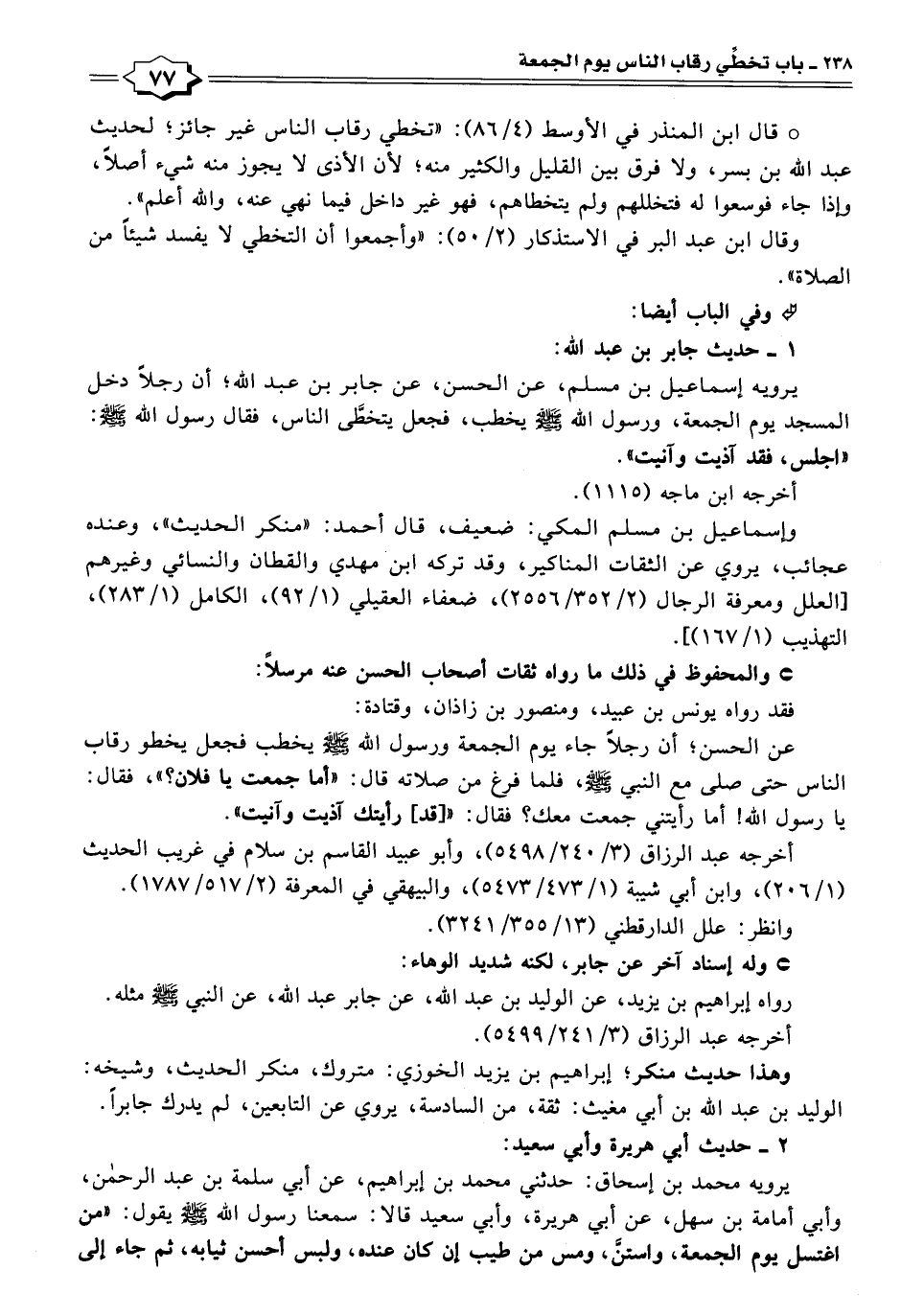 يرويه إسماعيل بن مسلم، عن الحسن، عن جابر بن عبد اللَّه؛ أن رجلًا دخل المسجد يوم الجمعة، ورسول اللَّه -صلى اللَّه عليه وسلم- يخطب، فجعل يتخطَّى الناس، فقال رسول اللَّه -صلى اللَّه عليه وسلم-: "اجلس، فقد آذيت وآنيت".