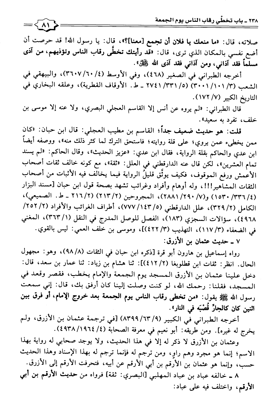وعثمان بن الأزرق لا ذكر له إلا في هذا الحديث، ولا يوجد صحابي له رواية بهذا الاسم؛ إنما هو مجرد وهم راوٍ، ومن ترجم له فإنما ترجم له بهذا الإسناد وهذا الحديث حسب، وإنما هو عثمان بن الأرقم بن أبي الأرقم عن أبيه، فتحرفت الأرقم إلى الأزرق.