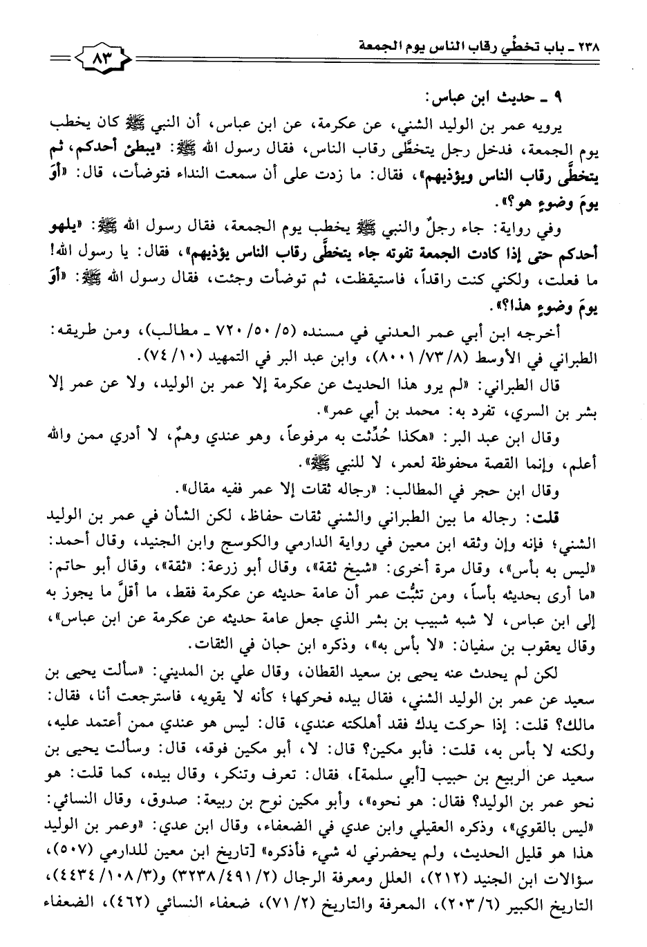 يرويه عمر بن الوليد الشني، عن عكرمة، عن ابن عباس، أن النبي -صلى اللَّه عليه وسلم- كان يخطب يوم الجمعة، فدخل رجل يتخطَّى رقاب الناس، فقال رسول اللَّه -صلى اللَّه عليه وسلم-: "يبطئ أحدكم، ثم يتخطَّى رقاب الناس ويؤذيهم"، فقال: ما زدت على أن سمعت النداء فتوضأت، قال: "أوَ يومَ وضوءٍ هو؟ ".