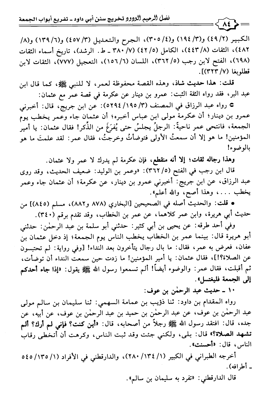 * رواه عبد الرزاق في المصنف (٣/ ١٩٥/ ٥٢٩٤): عن ابن جريج، قال: أخبرني عمرو بن دينار؛ أن عكرمة مولى ابن عباس أخبره؛ أن عثمان جاء وعمر يخطب يوم الجمعة، فانتحى عمر ناحيةً: الرجلُ يجلسُ حتى يُفرَغَ من الذِّكر! فقال عثمان: يا أمير المؤمنين! ما هو إلا أن سمعتُ الأولى فتوضاتُ وخرجتُ، فقال عمر: لقد علمتَ ما هو بالوضوء!