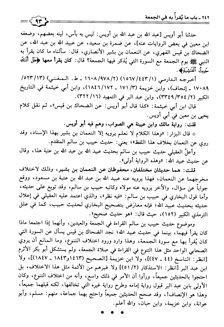 وموضوع حديث حبيب بن سالم القراءة في الجمعة والعيدين، وأنهما إذا اجتمعا ماذا كان يقرأ فيهما، بينما في حديث عبيد اللَّه؛ نجد الضحاك بن قيس يسأل عن السورة التي كان يُقرأ بها مع سورة الجمعة، وهذا وارد ورود اختلاف التنوع، وما المانع أن يروي الصحابي الواحد مثل هذا التنوع في القراءة في صلاة الجمعة، ولم يستشكل أبو بكر الأثرم [انظر: الناسخ (٤٤ - ٤٧)]، ولا ابن خزيمة [الصحيح (١٤٦٣ و ١٨٤٣ - ١٨٤٧)]، ولا ابن عبد البر [انظر: الاستذكار (٢/ ٥١)] ولا غيرهم من الأئمة مثل هذا الاختلاف، بل احتجوا بالحديثين جميعًا، ورأوا أن الأمر في ذلك واسع، وأنه من اختلاف التنوع، وكان الأولى بابن عبد البر قبول رواية إمامه وطرح رواية غيره التي تخالفها، لكنه قبلهما جميعًا، وهذا هو الإنصاف!، وقد صحح الحديثين جميعًا واحتج بهما جماعة، منهم: مسلم، وأبو عوانة، وابن خزيمة، وابن حبان، واللَّه أعلم.