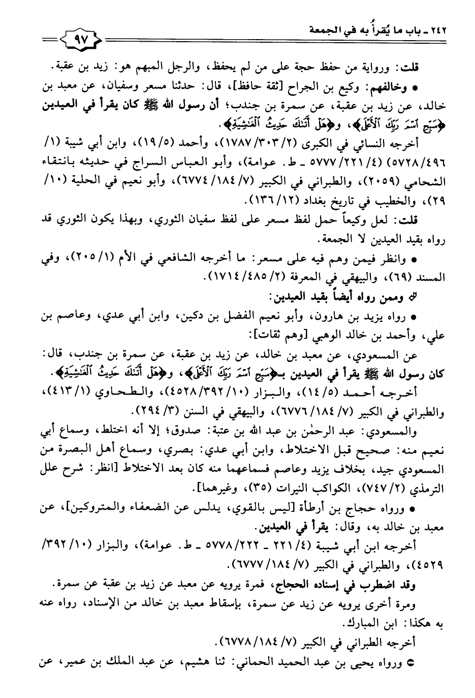 • وخالفهم: وكيع بن الجراح [ثقة حافظ]، قال: حدثنا مسعر وسفيان، عن معبد بن خالد، عن زيد بن عقبة، عن سمرة بن جندب؛ أن رسول اللَّه -صلى اللَّه عليه وسلم- كان يقرأ في العيدين {سَبِّحِ اسْمَ رَبِّكَ الْأَعْلَى}، و {هَلْ أَتَاكَ حَدِيثُ الْغَاشِيَةِ}.