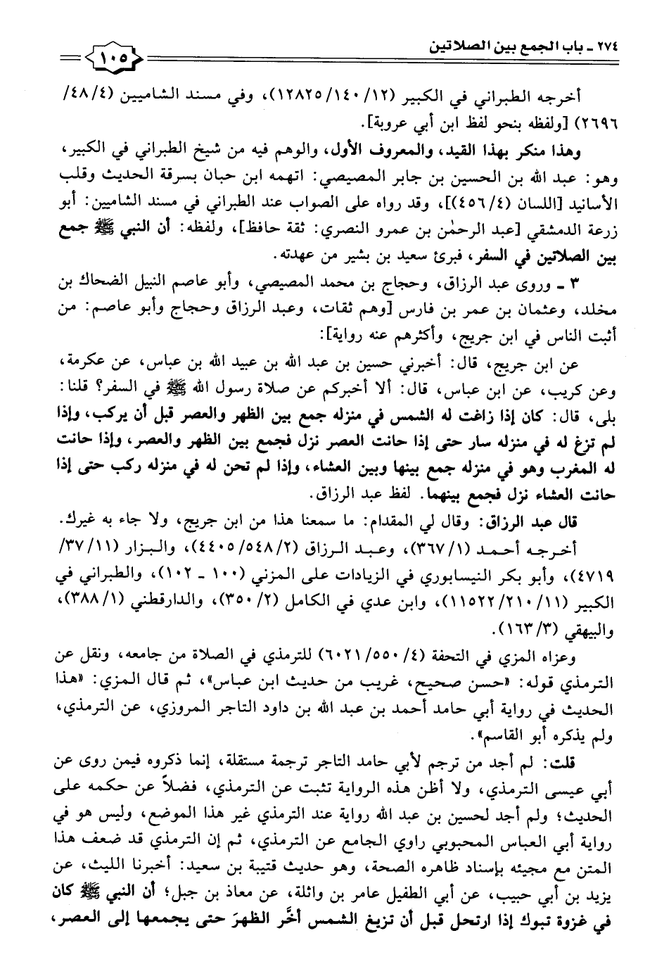 عن ابن جريج، قال: أخبرني حسين بن عبد الله بن عبيد الله بن عباس، عن عكرمة، وعن كريب، عن ابن عباس، قال: ألا أخبركم عن صلاة رسول الله -صَلَّى اللهُ عَلَيْهِ وَسَلَّمَ- في السفر؟ قلنا: بلى، قال: كان إذا زاغت له الشمس في منزله جمع بين الظهر والعصر قبل أن يركب، وإذا لم تزغ له في منزله سار حتى إذا حانت العصر نزل فجمع بين الظهر والعصر، وإذا حانت له المغرب وهو في منزله جمع بينها وبين العشاء، وإذا لم تحن له في منزله ركب حتى إذا حانت العشاء نزل فجمع بينهما. لفظ عبد الرزاق.