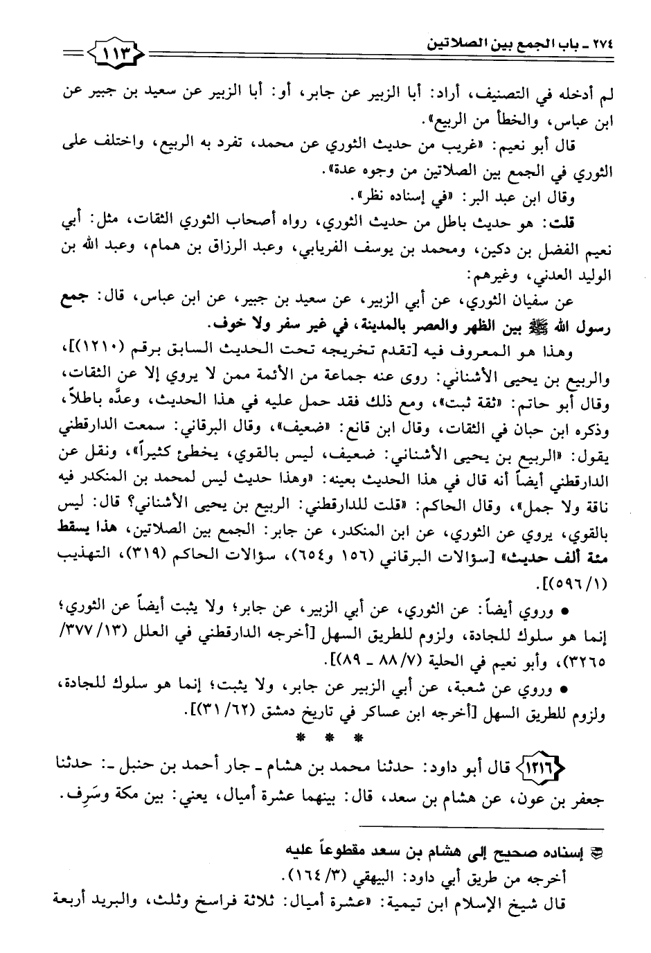 قال أبو نعيم: "غريب من حديث الثوري عن محمد، تفرد به الربيع، واختلف على الثوري في الجمع بين الصلاتين من وجوه عدة".