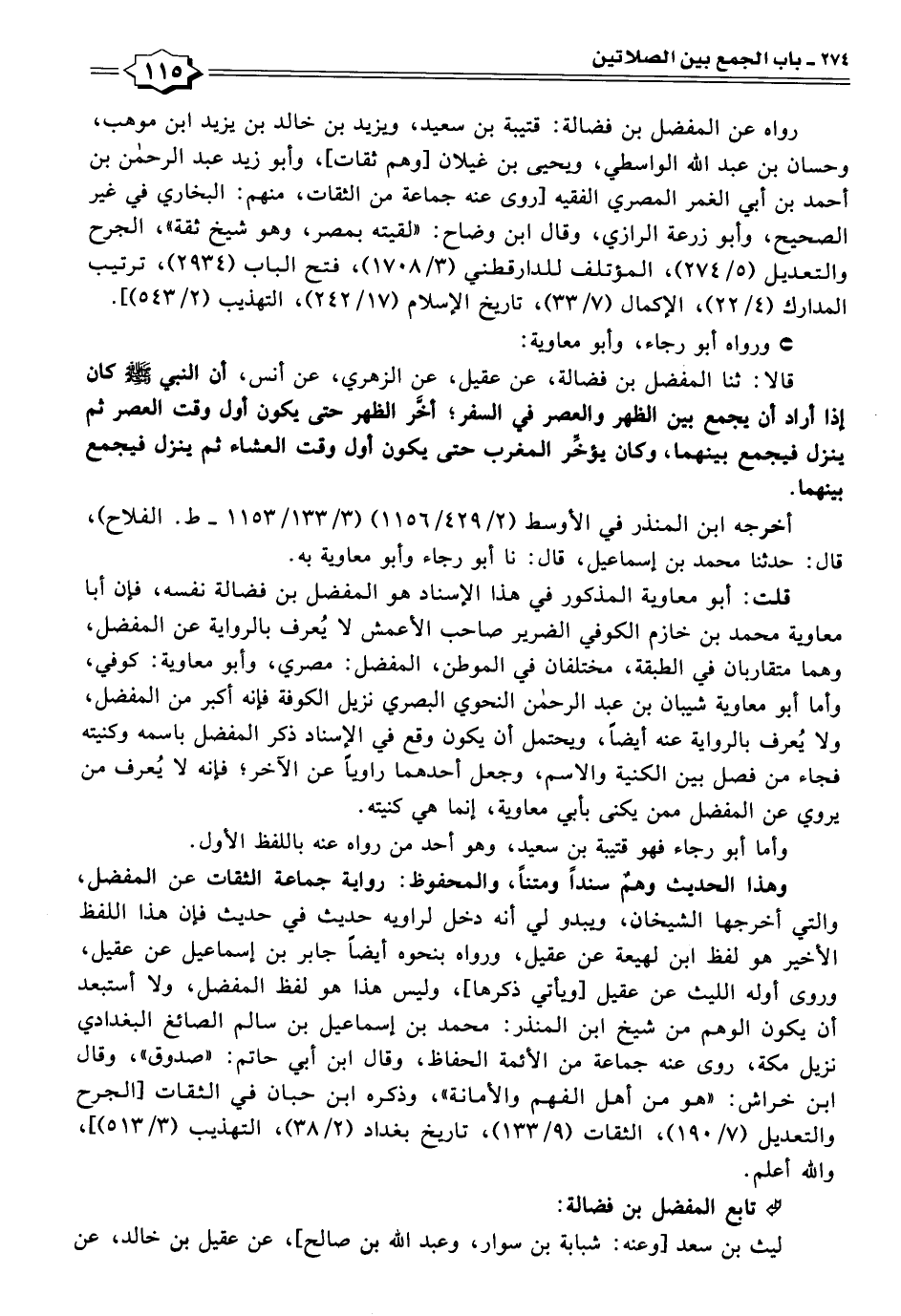 قالا: ثنا المفضل بن فضالة، عن عقيل، عن الزهري، عن أنس، أن النبي -صَلَّى اللهُ عَلَيْهِ وَسَلَّمَ- كان إذا أراد أن يجمع بين الظهر والعصر في السفر؛ أخَّر الظهر حتى يكون أول وقت العصر ثم ينزل فيجمع بينهما، وكان يؤخِّر المغرب حتى يكون أول وقت العشاء ثم ينزل فيجمع بينهما.