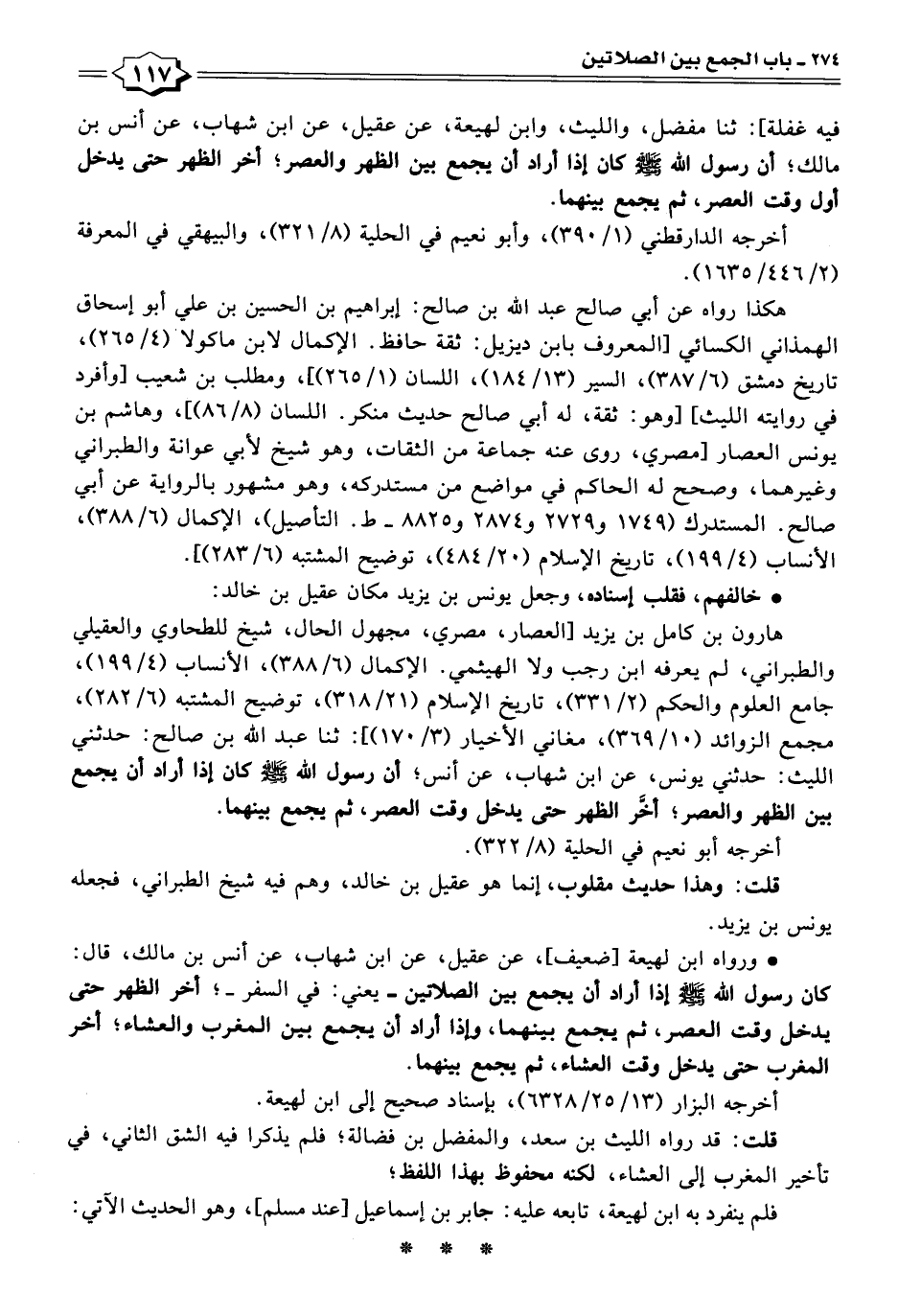 • ورواه ابن لهيعة [ضعيف]، عن عقيل، عن ابن شهاب، عن أنس بن مالك، قال: كان رسول الله -صَلَّى اللهُ عَلَيْهِ وَسَلَّمَ- إذا أراد أن يجمع بين الصلاتين -يعني: في السفر-؛ أخَّر الظهر حتى يدخل وقت العصر، ثم يجمع بينهما، وإذا أراد أن يجمع بين المغرب والعشاء؛ أخَّر المغرب حتى يدخل وقت العشاء، ثم يجمع بينهما.