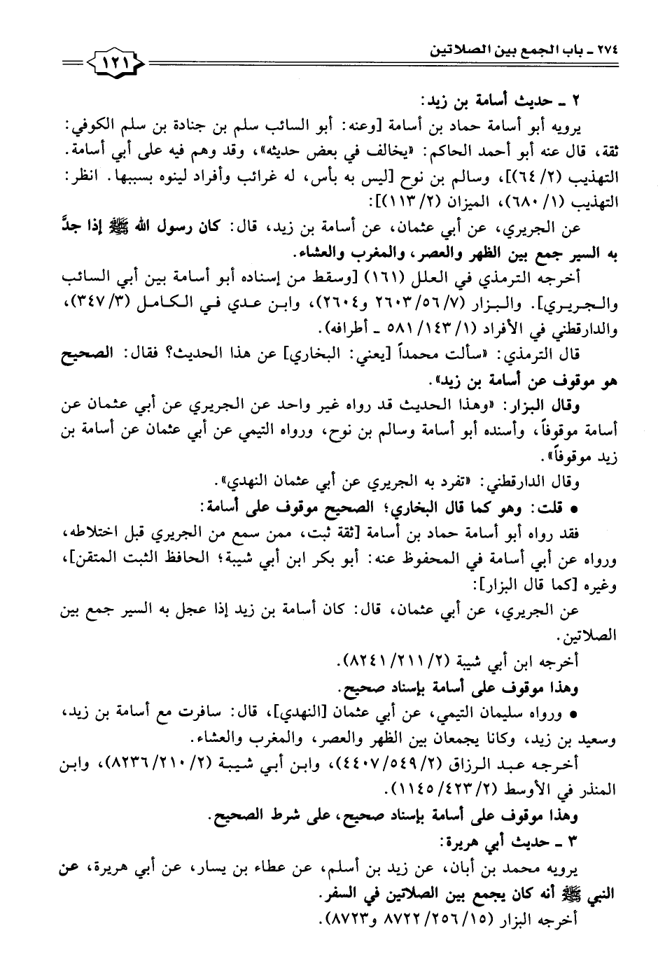 عن الجريري، عن أبي عثمان، عن أسامة بن زيد، قال: كان رسول الله -صَلَّى اللهُ عَلَيْهِ وَسَلَّمَ- إذا جدَّ به السير جمع بين الظهر والعصر، والمغرب والعشاء.