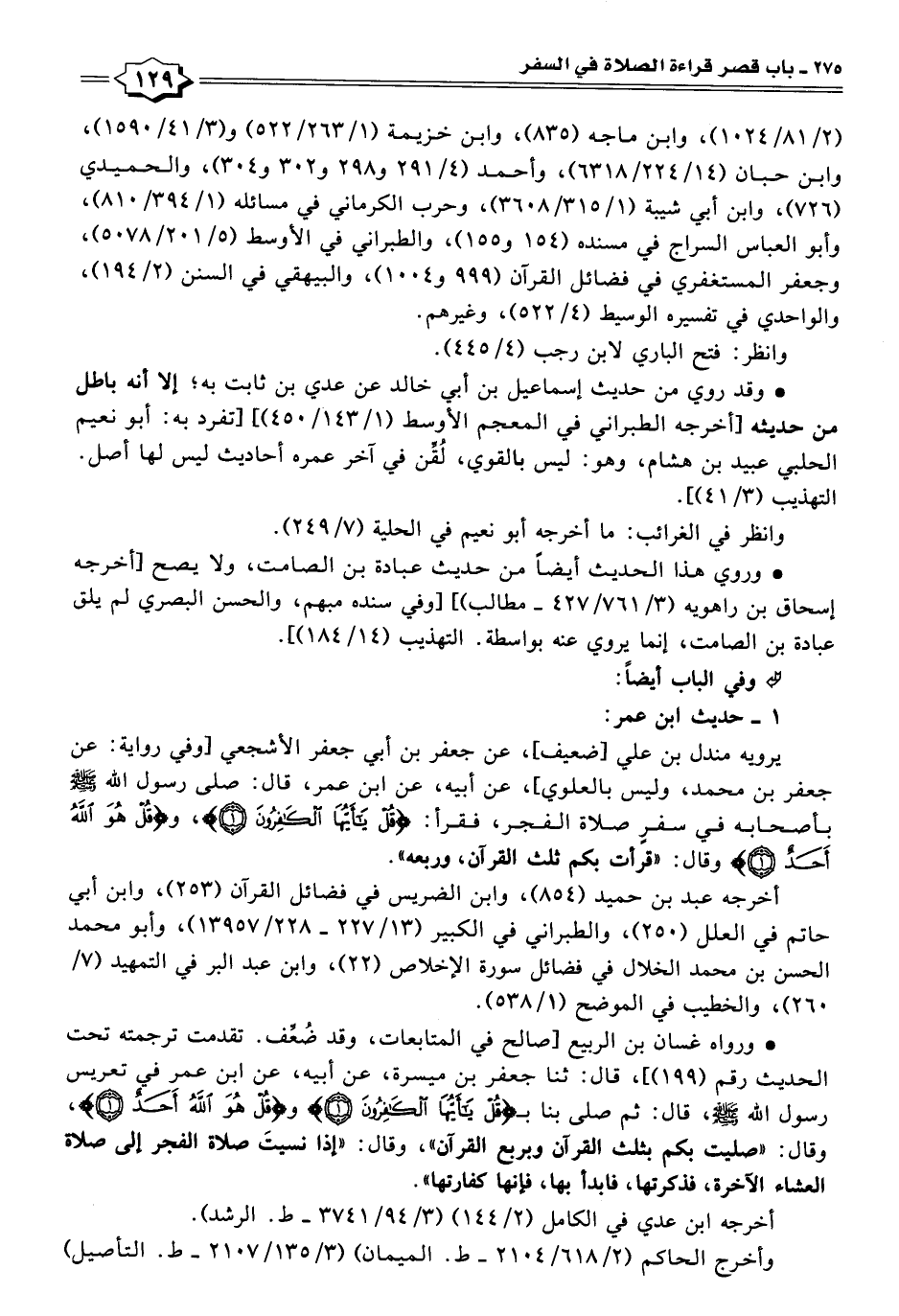 يرويه مندل بن علي [ضعيف]، عن جعفر بن أبي جعفر الأشجعي [وفي رواية: عن جعفر بن محمد، وليس بالعلوي]، عن أبيه، عن ابن عمر، قال: صلى رسول الله -صَلَّى اللهُ عَلَيْهِ وَسَلَّمَ- بأصحابه في سفرٍ صلاة الفجر، فقرأ: {قُلْ يَاأَيُّهَا الْكَافِرُونَ (١)}، و {قُلْ هُوَ اللَّهُ أَحَدٌ (١)} وقال: "قرأت بكم ثلث القرآن، وربعه".