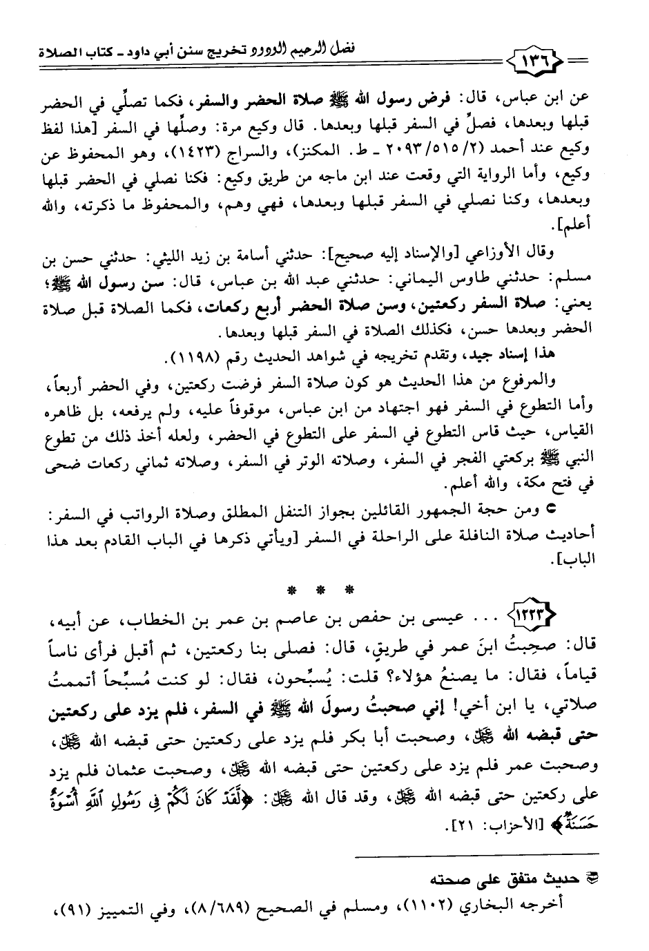 ١٢٢٣ - . . . عيسى بن حفص بن عاصم بن عمر بن الخطاب، عن أبيه، قال: صحِبتُ ابنَ عمر في طريقٍ، قال: فصلى بنا ركعتين، ثم أقبل فرأى ناسًا قيامًا، فقال: ما يصنعُ هؤلاء؟ قلت: يُسبِّحون، فقال: لو كنت مُسبِّحًا أتممتُ صلاتي، يا ابن أخي! إني صحبتُ رسولَ الله -صَلَّى اللهُ عَلَيْهِ وَسَلَّمَ- في السفر، فلم يزد على ركعتين حتى قبضه الله -عَزَّ وَجَلَّ-، وصحبت أبا بكر فلم يزد على ركعتين حتى قبضه الله -عَزَّ وَجَلَّ-، وصحبت عمر فلم يزد على ركعتين حتى قبضه الله -عَزَّ وَجَلَّ-، وصحبت عثمان فلم يزد على ركعتين حتى قبضه الله -عَزَّ وَجَلَّ-، وقد قال الله -عَزَّ وَجَلَّ-: {لَقَدْ كَانَ لَكُمْ فِي رَسُولِ اللَّهِ أُسْوَةٌ حَسَنَةٌ} [الأحزاب: ٢١].