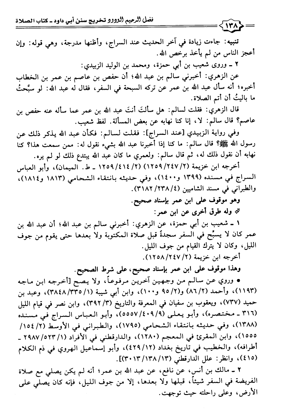 ١ - شعيب بن أبي حمزة، عن الزهري: أخبرني سالم بن عبد الله؛ أن عبد الله بن عمر كان لا يسبِّح في السفر سجدةً قبل صلاة المكتوبة ولا بعدها حتى يقوم من جوف الليل، وكان لا يترك القيام من جوف الليل.
