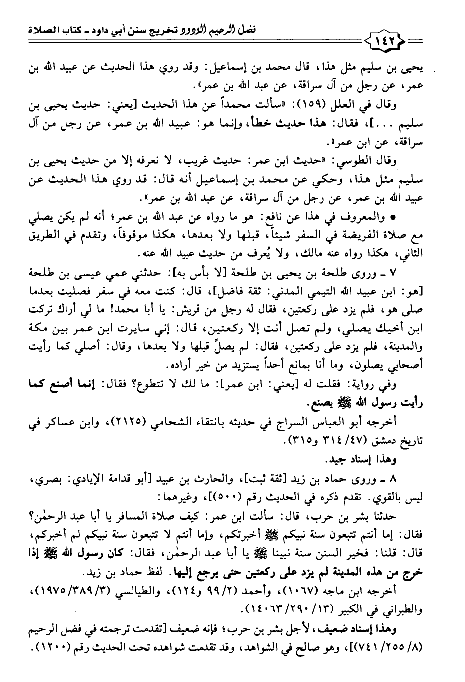 ٧ - وروى طلحة بن يحيى بن طلحة [لا بأس به]: حدثني عمي عيسى بن طلحة [هو: ابن عبيد الله التيمي المدني: ثقة فاضل]، قال: كنت معه في سفر فصليت بعدما صلى هو، فلم يزد على ركعتين، فقال له رجل من قريش: يا أبا محمد! ما لي أراك تركت ابن أخيك يصلي، ولم تصل أنت إلا ركعتين، قال: إني سايرت ابن عمر بين مكة والمدينة، فلم يزد على ركعتين، فقال: لم يصلِّ قبلها ولا بعدها، وقال: أصلي كما رأيت أصحابي يصلون، وما أنا بمانع أحدًا يستزيد من خير أراده.