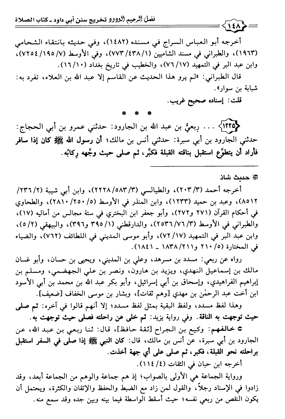 ١٢٢٥ - . . . رِبعيُّ بن عبد الله بن الجارود: حدثني عمرو بن أبي الحجاج: حدثني الجارود بن أبي سبرة: حدثني أنس بن مالك؛ أن رسول الله -صَلَّى اللهُ عَلَيْهِ وَسَلَّمَ- كان إذا سافر فأراد أن يتطوَّع استقبل بناقته القبلة فكبَّر، ثم صلى حيث وجَّهه رِكابُه.