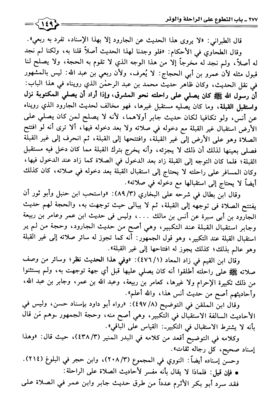 وقال الطحاوي في الأحكام: "فلو وجدنا لهذا الحديث أصلًا قلنا به، ولكنا لم نجد له أصلًا، ولم نجد له مخرجًا إلا من هذا الوجه الذي لا تقوم به الحجة، ولا يصلح لنا قبول مثله لأن عمرو بن أبي الحجاج: لا يُعرف، ولأن ربعي بن عبد الله: ليس بالمشهور في نقل الحديث، وكان ظاهر حديث محمد بن عبد الرحمن الذي رويناه في هذا الباب: أن رسول الله -صَلَّى اللهُ عَلَيْهِ وَسَلَّمَ- كان يصلي على راحلته نحو المشرق، وإذا أراد أن يصلي المكتوبة نزل واستقبل القبلة، وما كان يصليه مستقبل غيرها، فهو مخالف لحديث الجارود الذي رويناه عن أنس، ولو تكافيا لكان حديث جابر أولاهما، لأنه لا يصلح لمن كان يصلي على الأرض استقبال غير القبلة مع دخوله في صلاته ولا بعد دخوله فيها، ألا ترى أنه لو افتتح الصلاة وهو على الأرض إلى غير القبلة، وافتتحها إلى القبلة، ثم انحرف إلى غير القبلة فصلى بعينها لذلك أن ذلك لا يجزئه، وأنه يخرج بترك القبلة مما كان دخل فيه مستقبل القبلة؛ فلما كان التوجه إلى القبلة زاد بعد الدخول في الصلاة كما زاد عند الدخول فيها، وكان المسافر على راحلته لا يحتاج إلى استقبال القبلة بعد دخوله في صلاته، كان كذلك أيضًا لا يحتاج إلى استقبالها مع دخوله في صلاته".