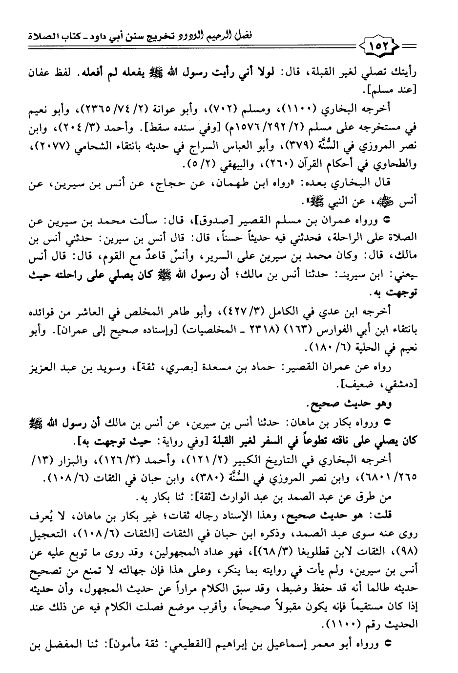 * ورواه عمران بن مسلم القصير [صدوق]، قال: سألت محمد بن سيرين عن الصلاة على الراحلة، فحدثني فيه حديثًا حسنًا، قال: قال أنس بن سيرين: حدثني أنس بن مالك، قال: وكان محمد بن سيرين على السرير، وأنسٌ قاعدٌ مع القوم، قال: قال أنس -يعني: ابن سيرين-: حدثنا أنس بن مالك؛ أن رسول الله -صَلَّى اللهُ عَلَيْهِ وَسَلَّمَ- كان يصلي على راحلته حيث توجهت به.