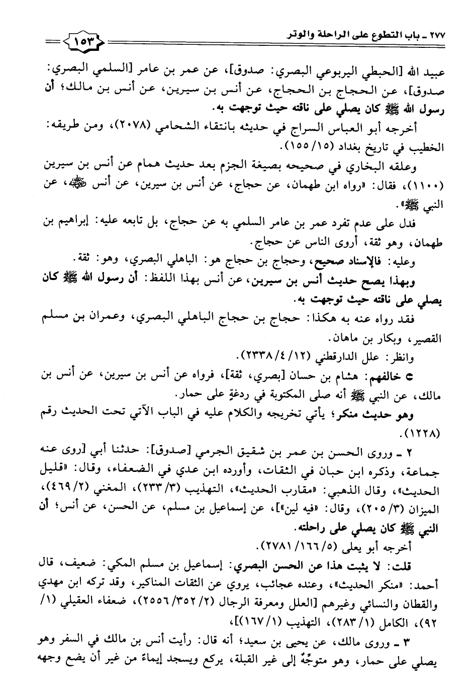 عبيد الله [الحبطي اليربوعي البصري: صدوق]، عن عمر بن عامر [السلمي البصري: صدوق]، عن الحجاج بن الحجاج، عن أنس بن سيرين، عن أنس بن مالك؛ أن رسول الله -صَلَّى اللهُ عَلَيْهِ وَسَلَّمَ- كان يصلي على ناقته حيث توجهت به.