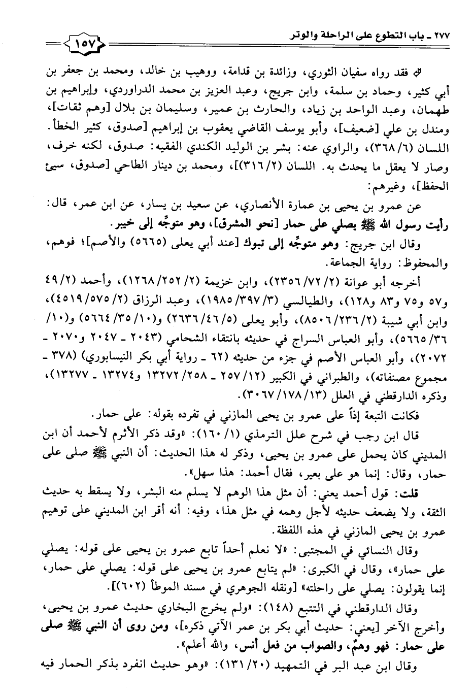 وقال النسائي في المجتبى: "لا نعلم أحدًا تابع عمرو بن يحيى على قوله: يصلي على حمار"، وقال في الكبرى: "لم يتابع عمرو بن يحيى على قوله: يصلي على حمار، إنما يقولون: يصلي على راحلته" [ونقله الجوهري في مسند الموطأ (٦٠٢)].