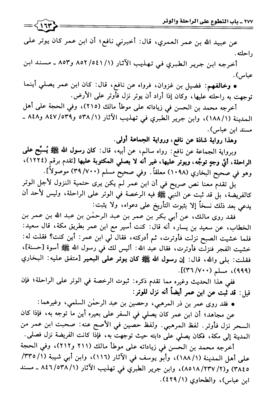 فقد روى مالك، عن أبي بكر بن عمر بن عبد الرحمن بن عبد الله بن عمر بن الخطاب، عن سعيد بن يسار، أنه قال: كنت أسير مع ابن عمر بطريق مكة، قال سعيد: فلما خشيت الصبح نزلت فأوترت، ثم أدركته، فقال لي ابن عمر: أين كنت؟ فقلت له: خشيت الفجر فنزلت فأوترت، فقال عبد الله: أليس لك في رسول الله -صَلَّى اللهُ عَلَيْهِ وَسَلَّمَ- أسوة [حسنة]، فقلت: بلى والله، قال: إن رسول الله -صَلَّى اللهُ عَلَيْهِ وَسَلَّمَ-، كان يوتر على البعير [متفق عليه: البخاري (٩٩٩)، مسلم (٧٠٠/ ٣٦٠)].
