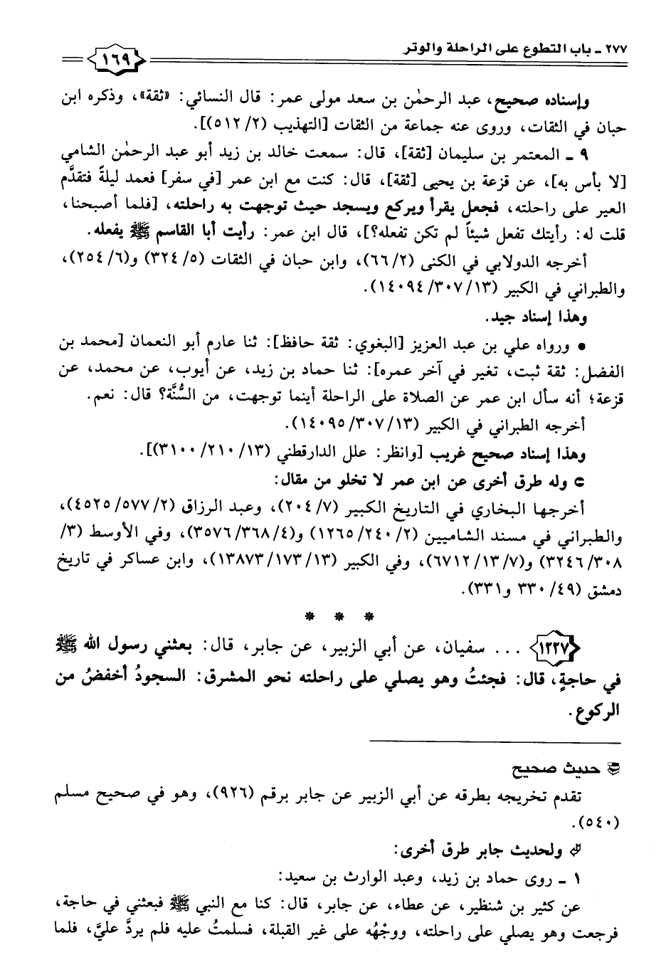 ٩ - المعتمر بن سليمان [ثقة]، قال: سمعت خالد بن زيد أبو عبد الرحمن الشامي [لا بأس به]، عن قزعة بن يحيى [ثقة]، قال: كنت مع ابن عمر [في سفر] فعمد ليلةً فتقدَّم العير على راحلته، فجعل يقرأ ويركع ويسجد حيث توجهت به راحلته، [فلما أصبحنا، قلت له: رأيتك تفعل شيئًا لم تكن تفعله؟]، قال ابن عمر: رأيت أبا القاسم -صَلَّى اللهُ عَلَيْهِ وَسَلَّمَ- يفعله.