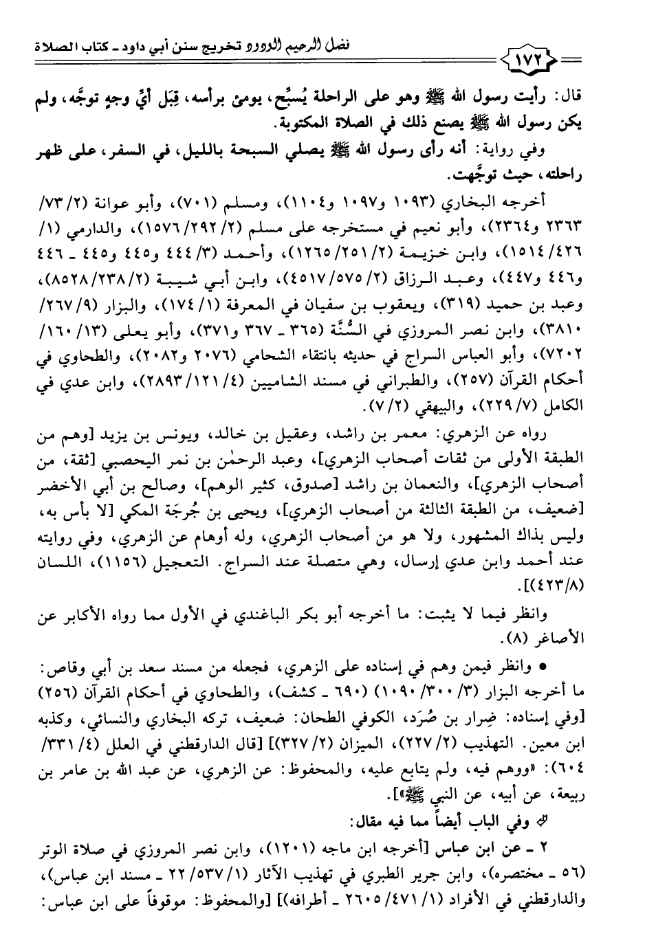 وفي رواية: أنه رأى رسول الله -صَلَّى اللهُ عَلَيْهِ وَسَلَّمَ- يصلي السبحة بالليل، في السفر، على ظهر راحلته، حيث توجَّهت.
